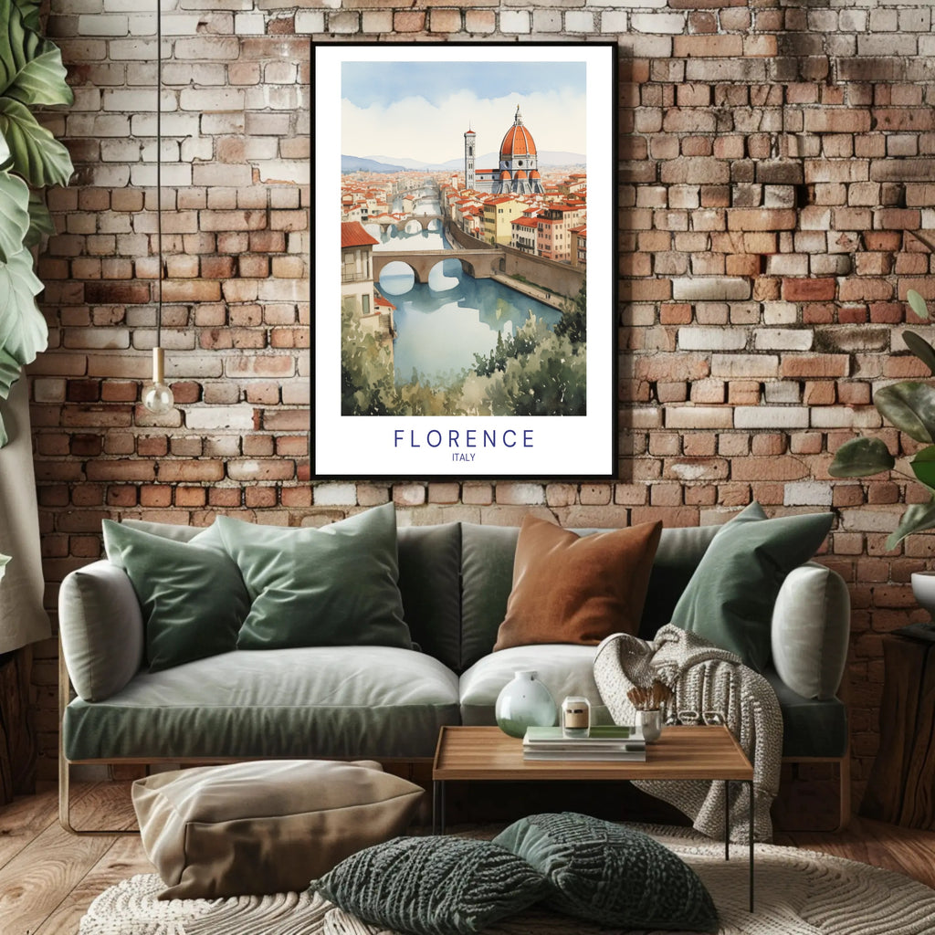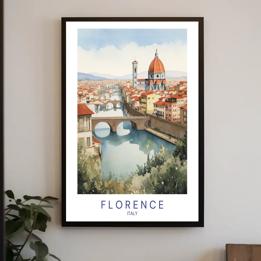 Experience the timeless charm of Florence with this captivating poster, which beautifully captures the essence of Italy’s Renaissance jewel. The artwork showcases the iconic Florence skyline, featuring the striking red dome of the Duomo and the meandering Arno River with its classic bridges. Executed in a modern watercolor style, the poster blends soft, serene colors with delicate brushstrokes to evoke a sense of peace and wanderlust. Ideal for travel enthusiasts and art lovers alike, this piece invites admiration for Florence's cultural and architectural splendor, making it a perfect addition to any space.
