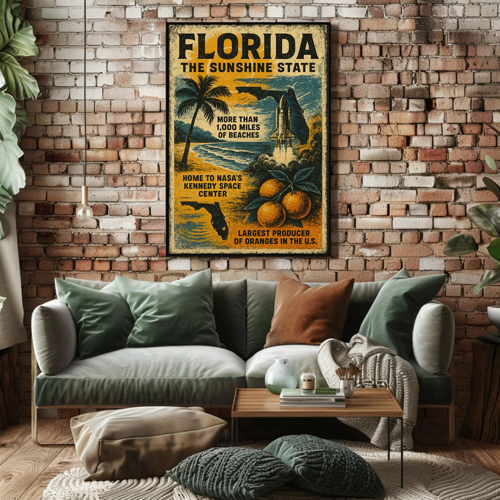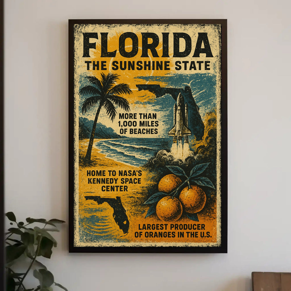 Capture the spirit of the Sunshine State with the Florida Beaches and Space Launch Vintage Travel Poster by PosterGoat — a retro-inspired wall art print that celebrates Florida’s sun-soaked beaches, NASA rocket launches, and iconic orange groves in one nostalgic composition.
