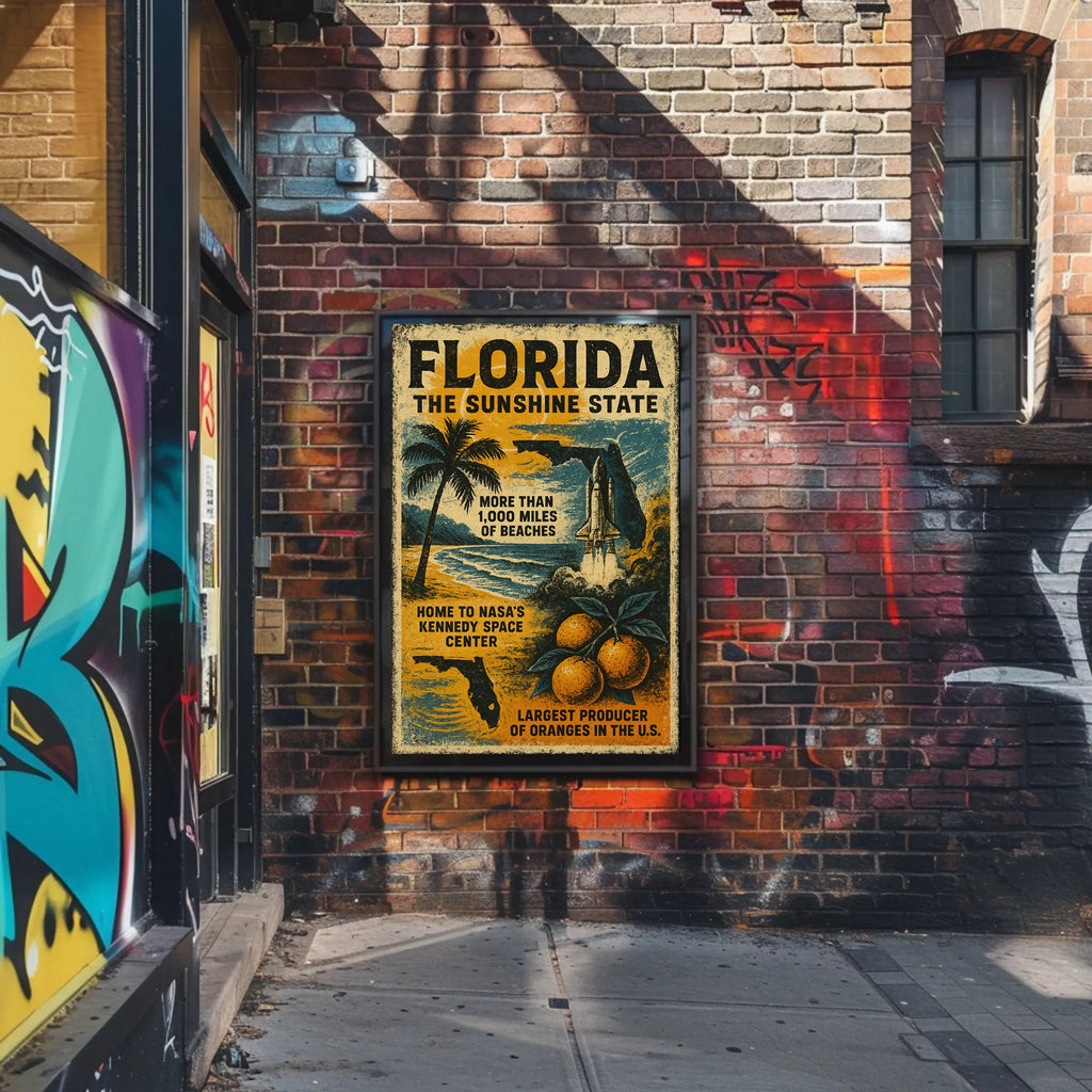 This poster features a distressed, vintage finish with bold typographic headlines, a swaying palm tree framing a sweeping shoreline, a dramatic space shuttle liftoff beside the outline of Florida, and richly textured oranges in the foreground — all rendered in warm, sun-faded tones that bring instant character to any room.