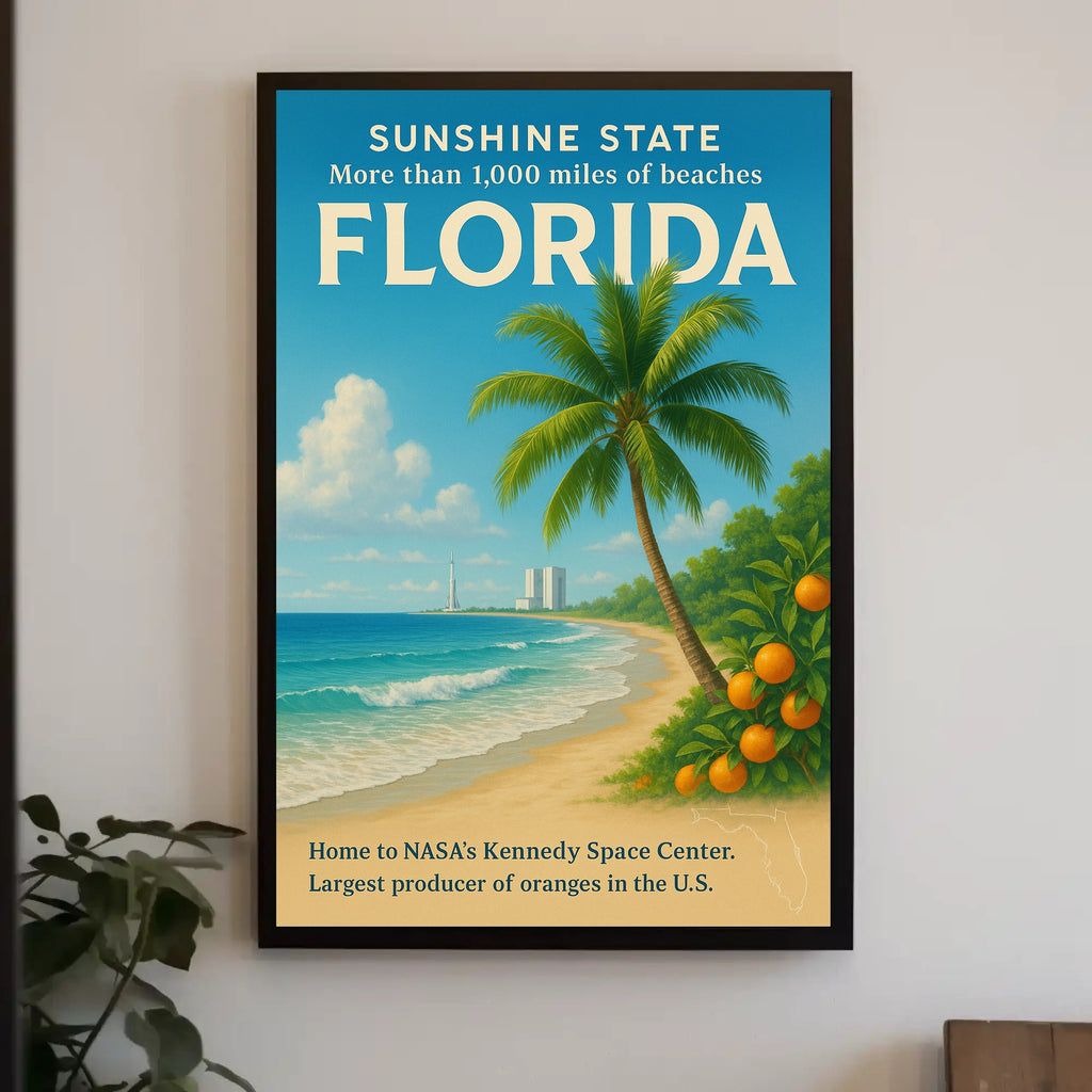 This piece sits squarely in Home & Garden > Decor > Artwork > Posters and combines themes of Florida Beaches, Space Exploration, and Vintage Travel for a unique wall statement. The design highlights Florida’s dual identity as both a sun-soaked coastline and the home of America’s space program — plus a nod to its famous orange groves.