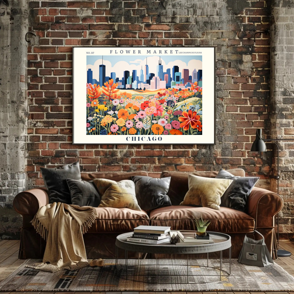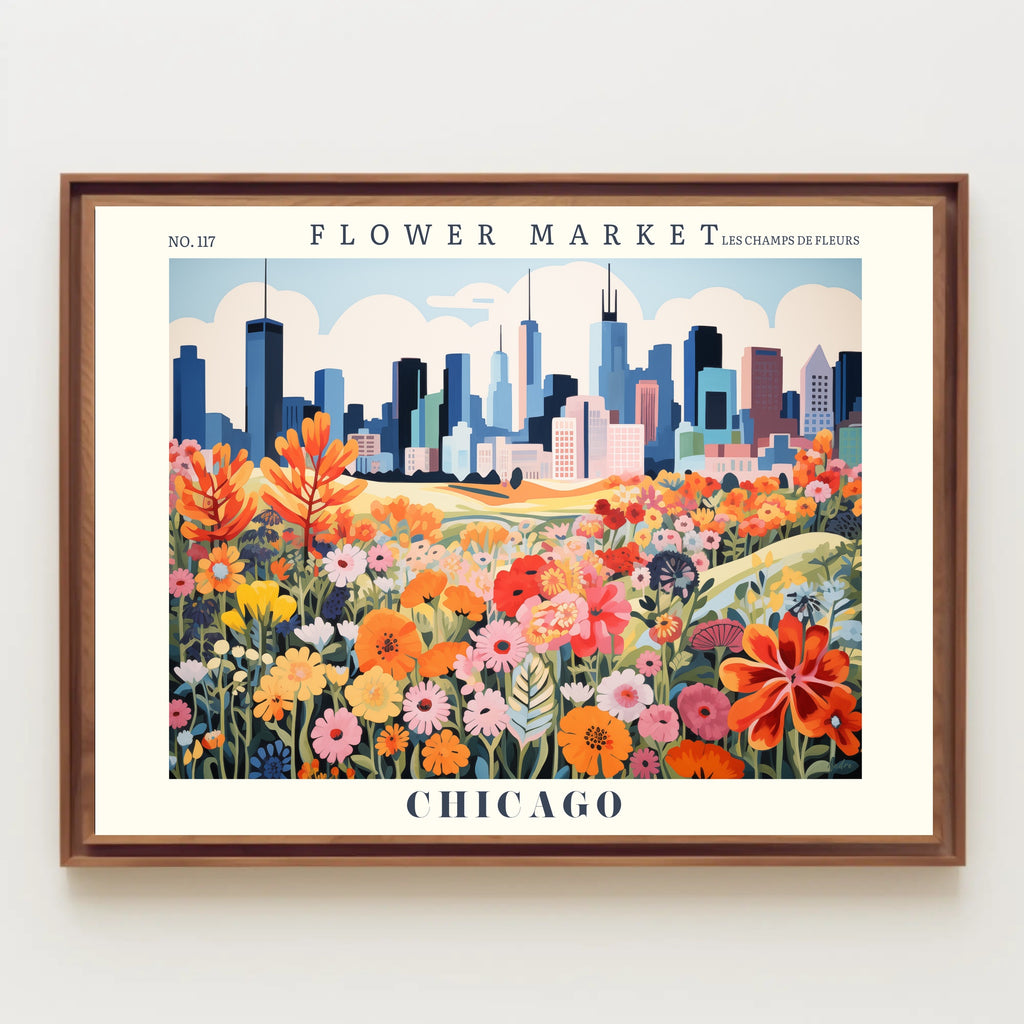 This vibrant poster captures the lively essence of a flower market set against the iconic skyline resembling Chicago. A kaleidoscope of blooming poppies, daisies, and lilies creates a cheerful foreground, harmoniously contrasting with the stylized skyscrapers in the distance. The vintage artistic style, rich in bold colors, evokes a joyous and energetic atmosphere, blending the tranquility of nature with urban excitement. The sophisticated inclusion of the French phrase "LES CHAMPS DE FLEURS" adds elegance. Ideal for those appreciating urban nature, vintage art, and city-themed decor, this piece brings a touch of international flair to any space.