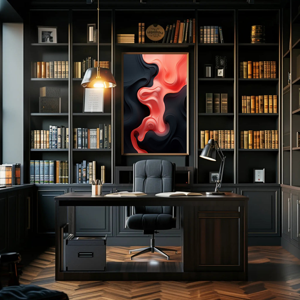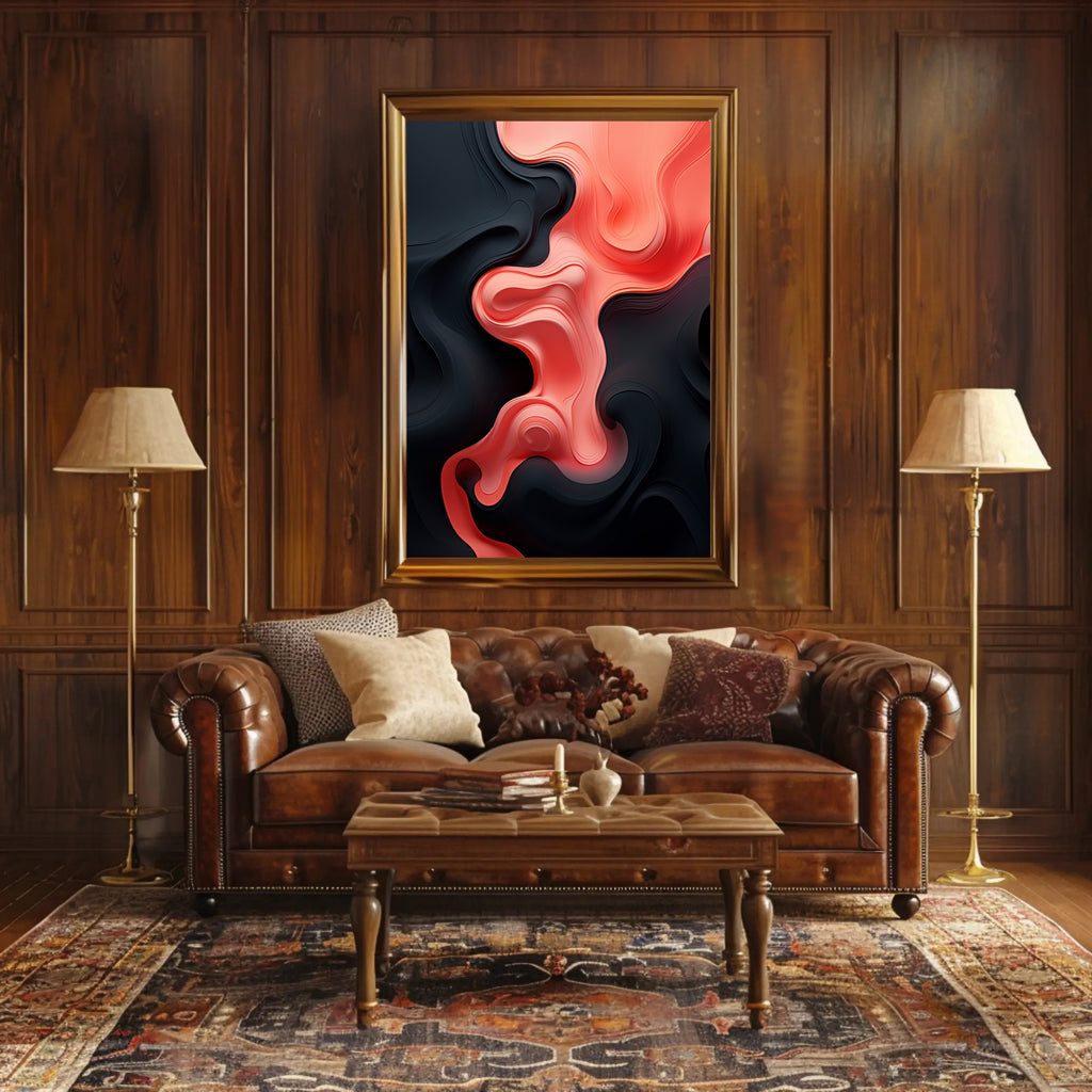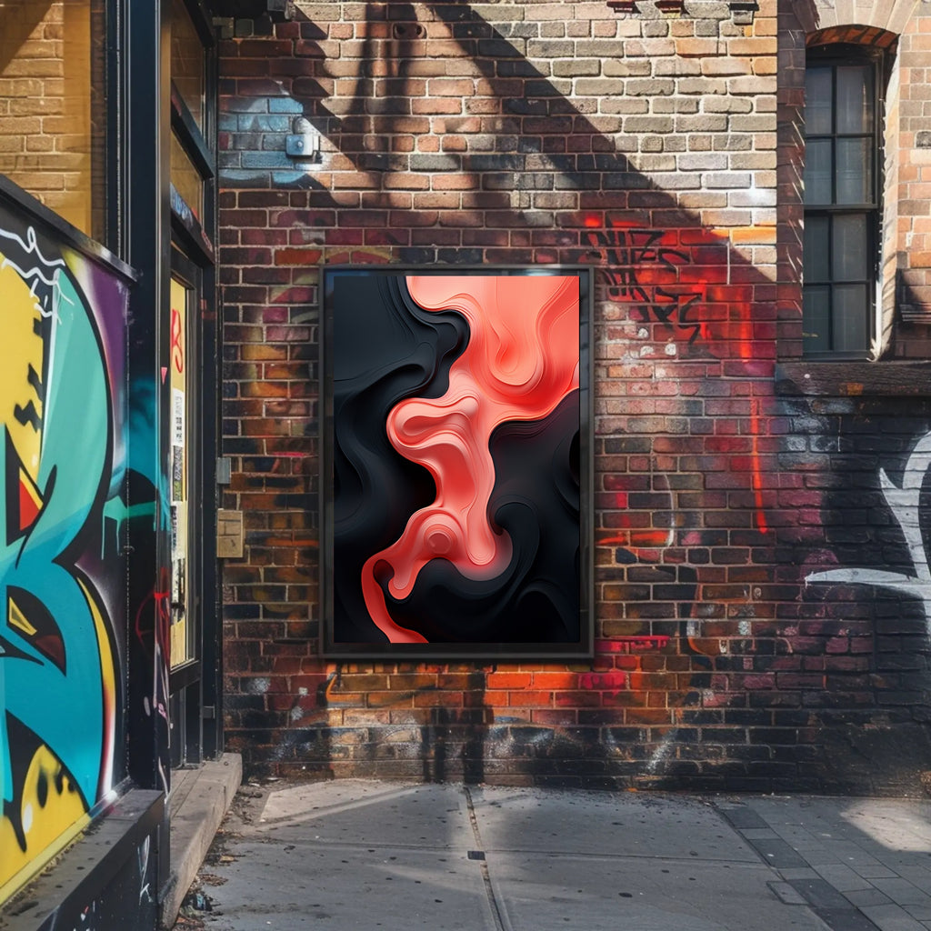 Introduce dynamic motion and modern sophistication to your walls with the Fluid Abstraction Abstract Poster from PosterGoat. This striking art print features sculpted, layered fluids in coral and deep charcoal tones that create a tactile, topographic illusion—perfect for minimalist and contemporary interiors.