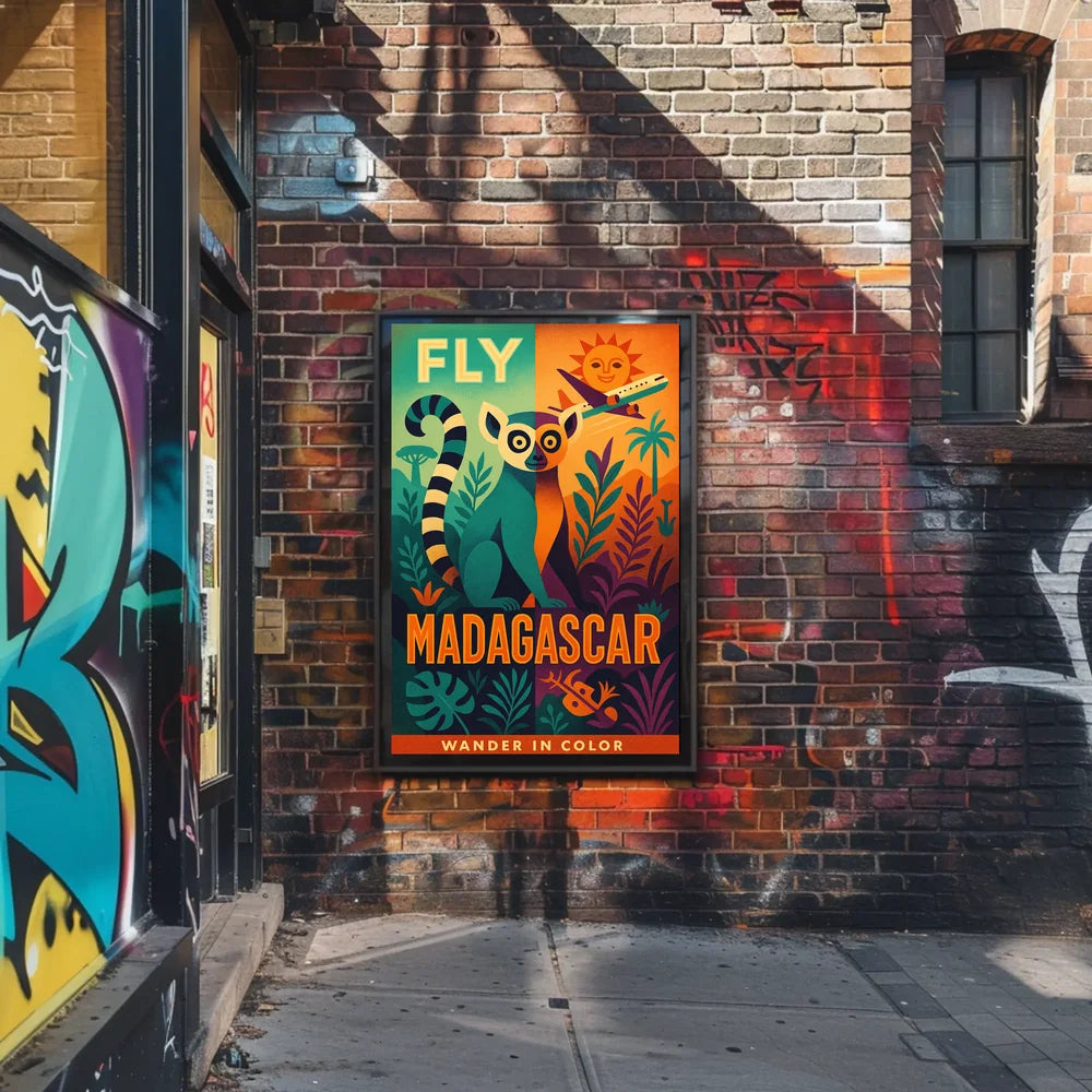 Explore the enchanting allure of Madagascar with this vibrant travel poster. With a retro, illustrative style, it captures the island's essence through a playful depiction of a native lemur, a soaring airplane, and a charming sun. The bold use of rich greens, oranges, and purples evokes a tropical atmosphere, inviting you to immerse yourself in the warmth and beauty of the region. Perfect for travel enthusiasts and adventure seekers, this poster promises an exotic escape into a world filled with wonder and natural splendor. Embark on a colorful journey and let your wanderlust soar.