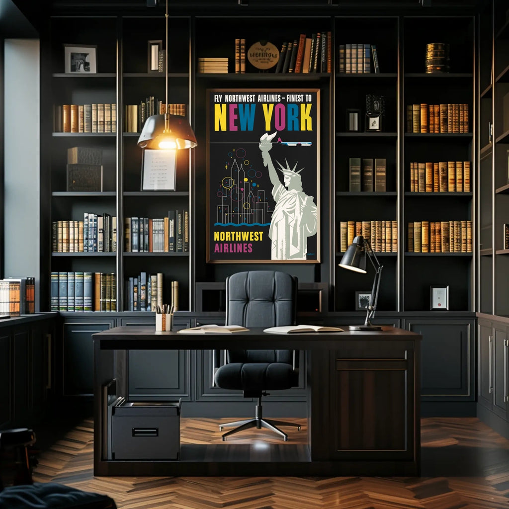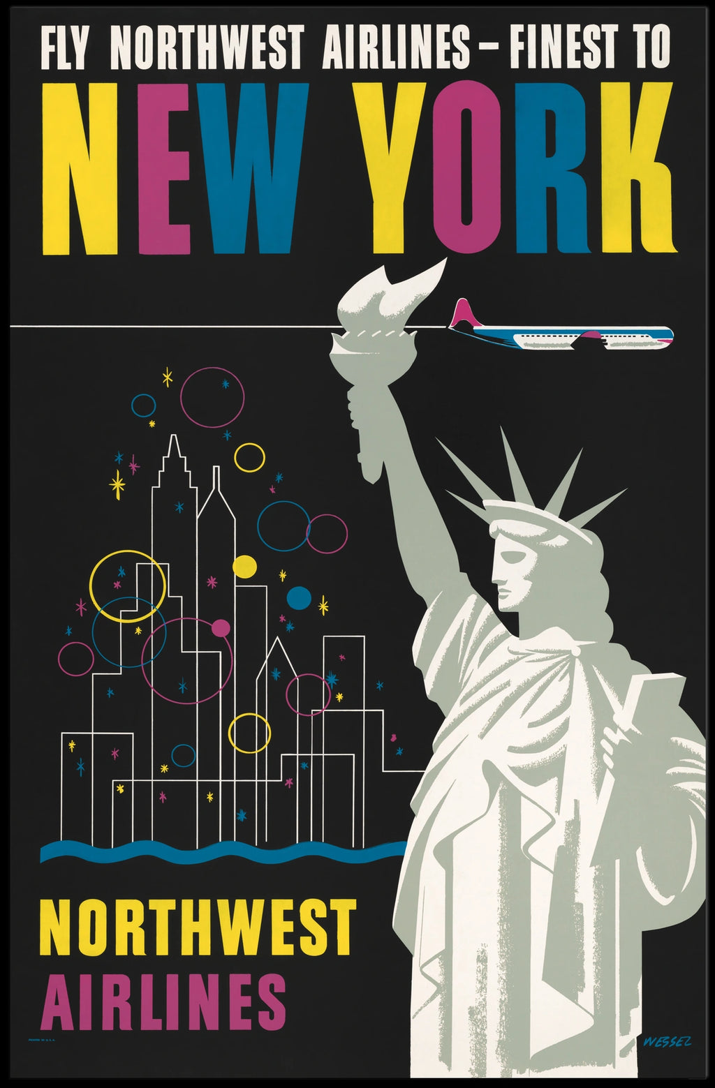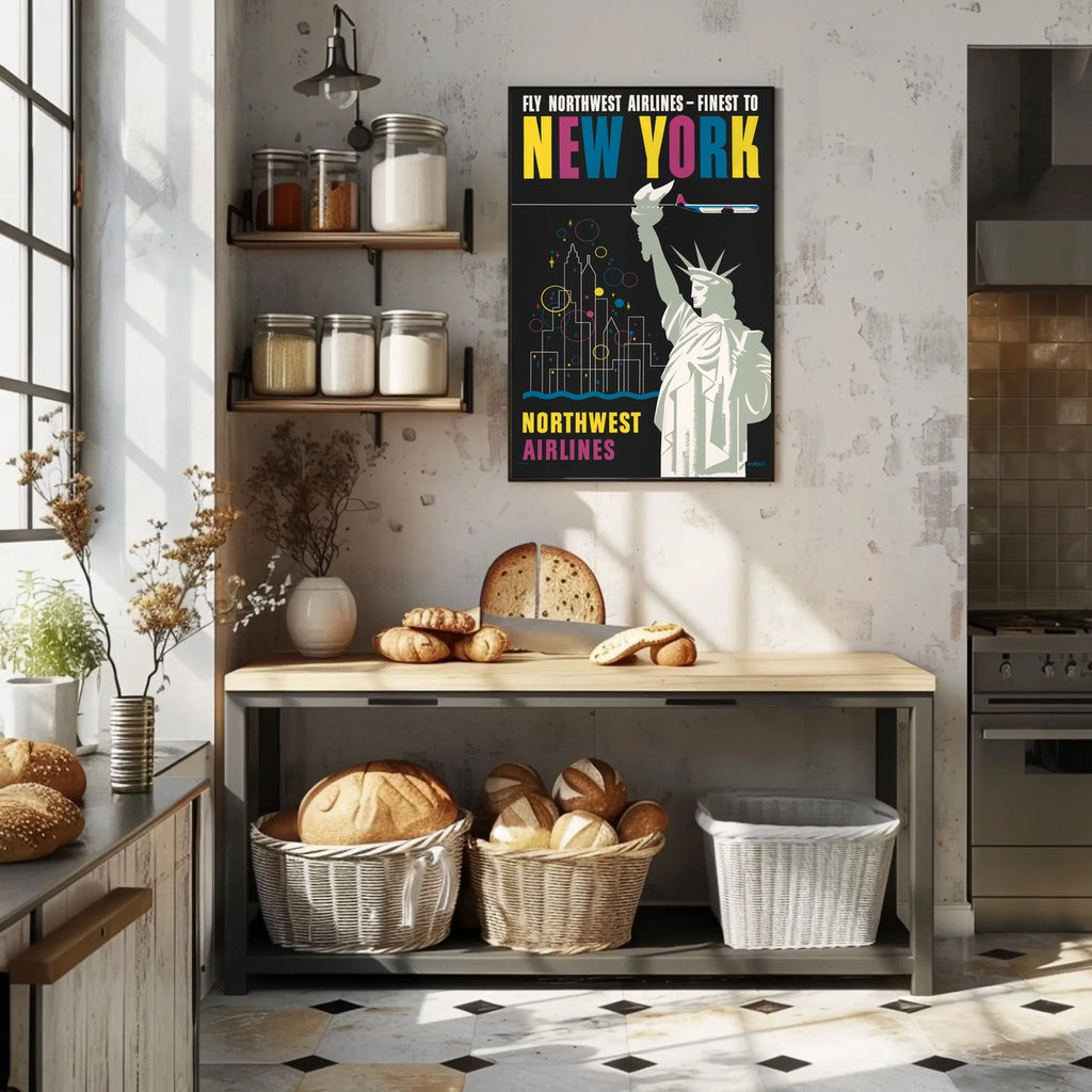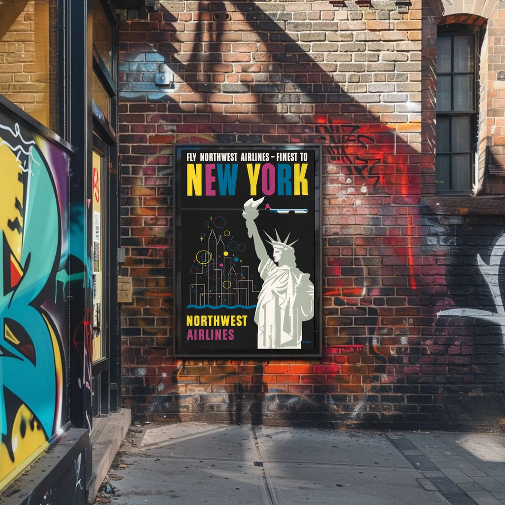 Transport your space to a golden era of air travel with this vintage-style travel poster. Celebrating mid-century exploration, it pairs a bold color palette with iconic landmarks—the Statue of Liberty and an abstracted New York skyline—and a bright jet that seems to skim the clouds. Ideal for living rooms, offices, or transit-themed spaces, it adds a sense of adventure and history to any wall.