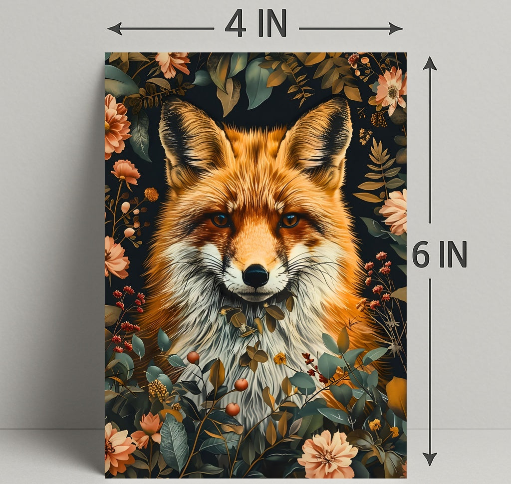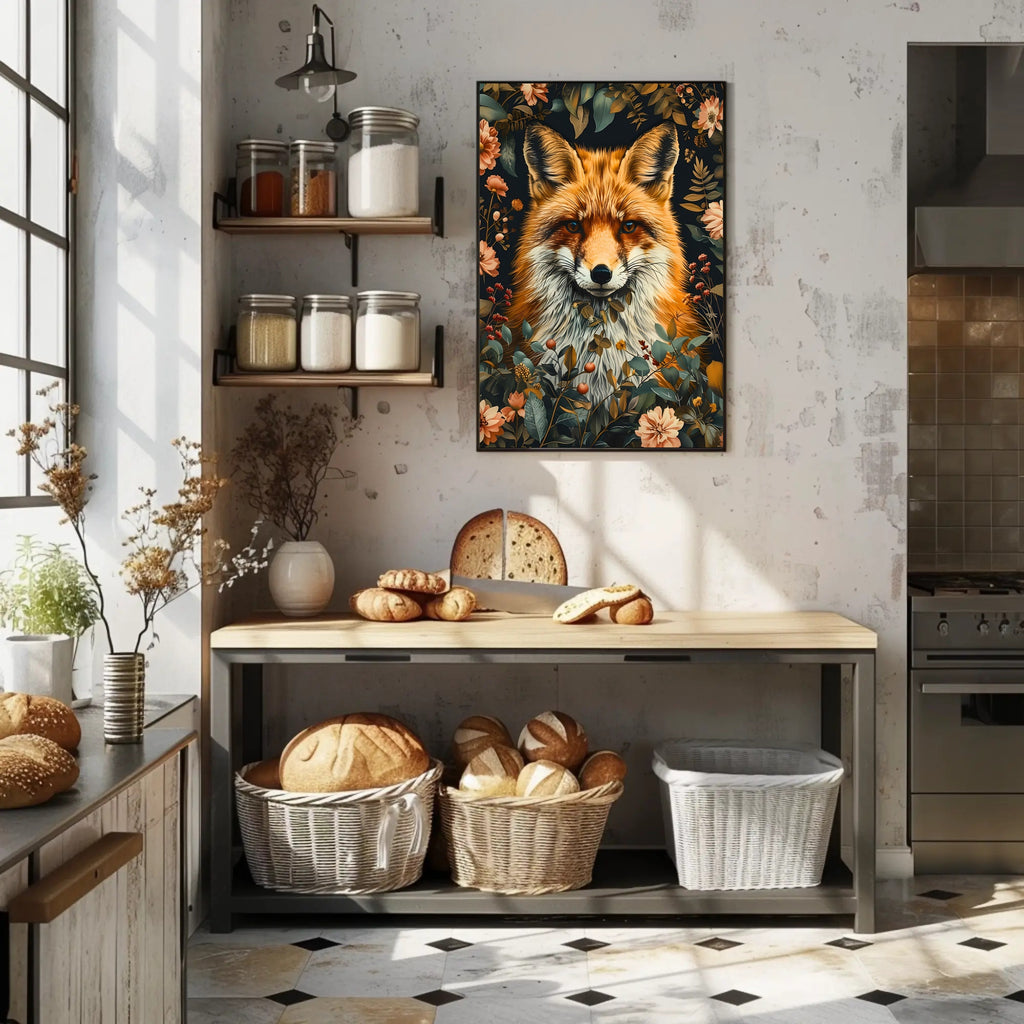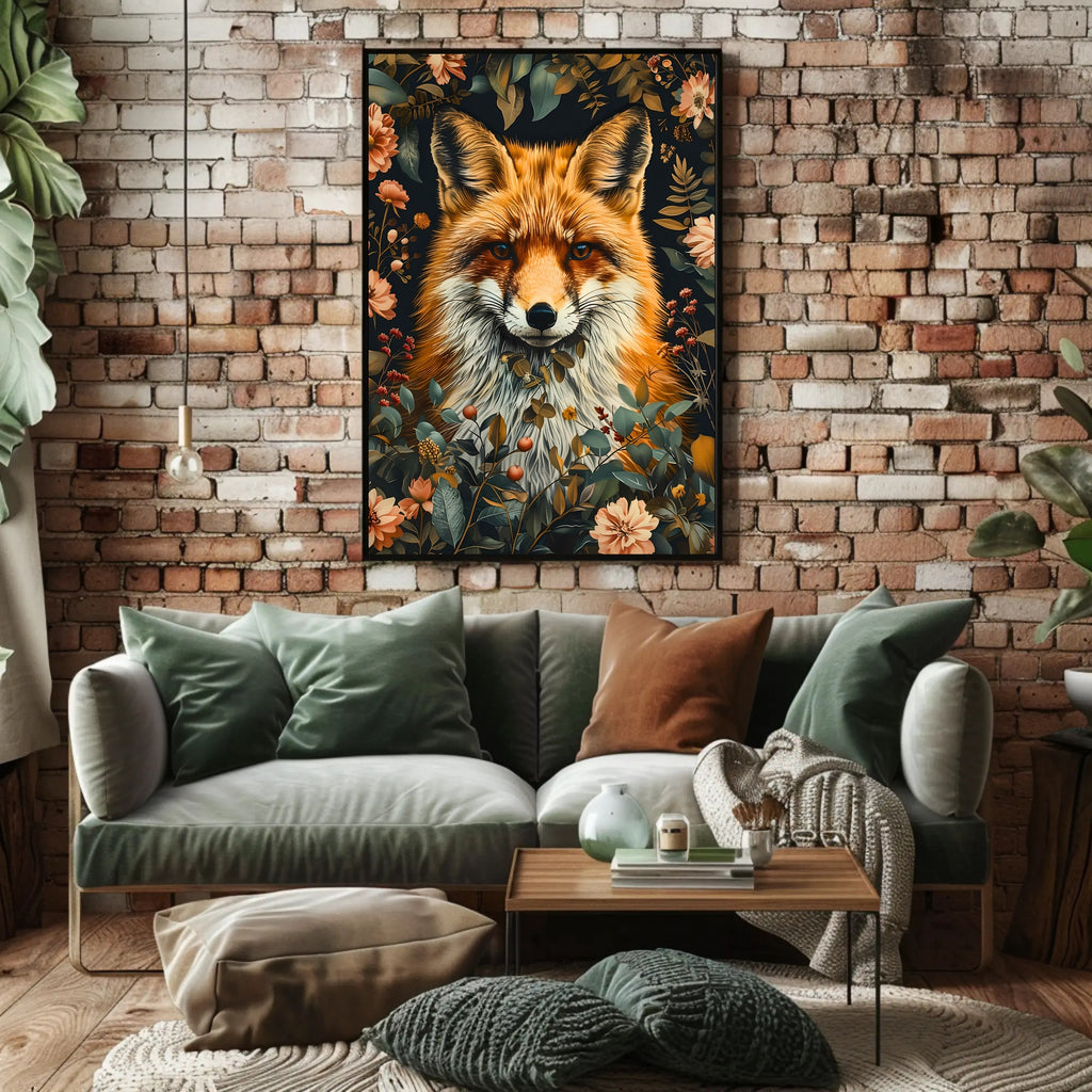 This poster’s balanced color palette — warm oranges, muted greens and soft peach florals against a deep backdrop — makes it an ideal focal point or a complementary piece in layered gallery walls. The carefully composed foreground foliage and subtle highlights around the fox’s face draw the eye and add depth, providing a sense of calm and connection to nature.