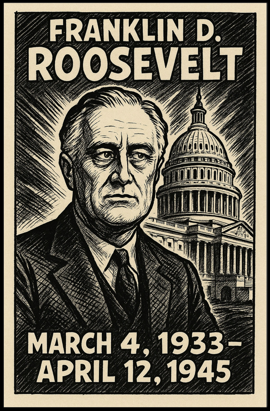 Elevate your space with a bold, black-and-white tribute to Franklin D. Roosevelt, the 32nd President of the United States. This line-art poster blends history with a retro comic style, perfect for history buffs, politics fans, and collectors alike.