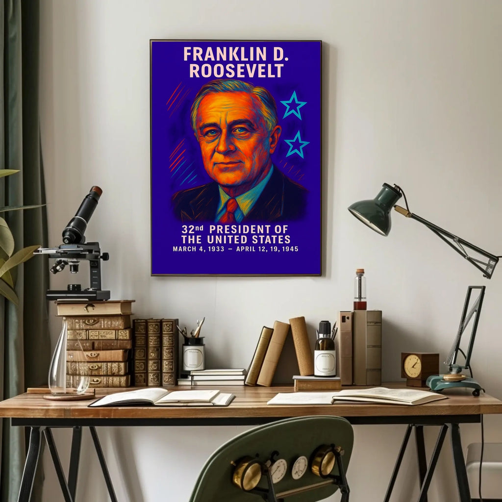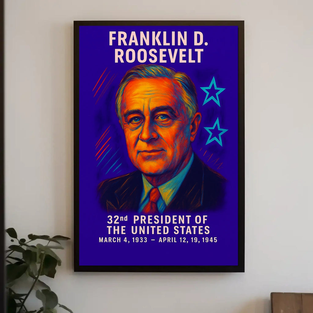 Capture a pivotal era with this Franklin D. Roosevelt 32nd President Poster. Blending timeless portrait-inspired artistry with scenic touches, it speaks to decor lovers and wanderlust spirits who value history, inspiration, and a refined, museum-like aesthetic in their spaces.