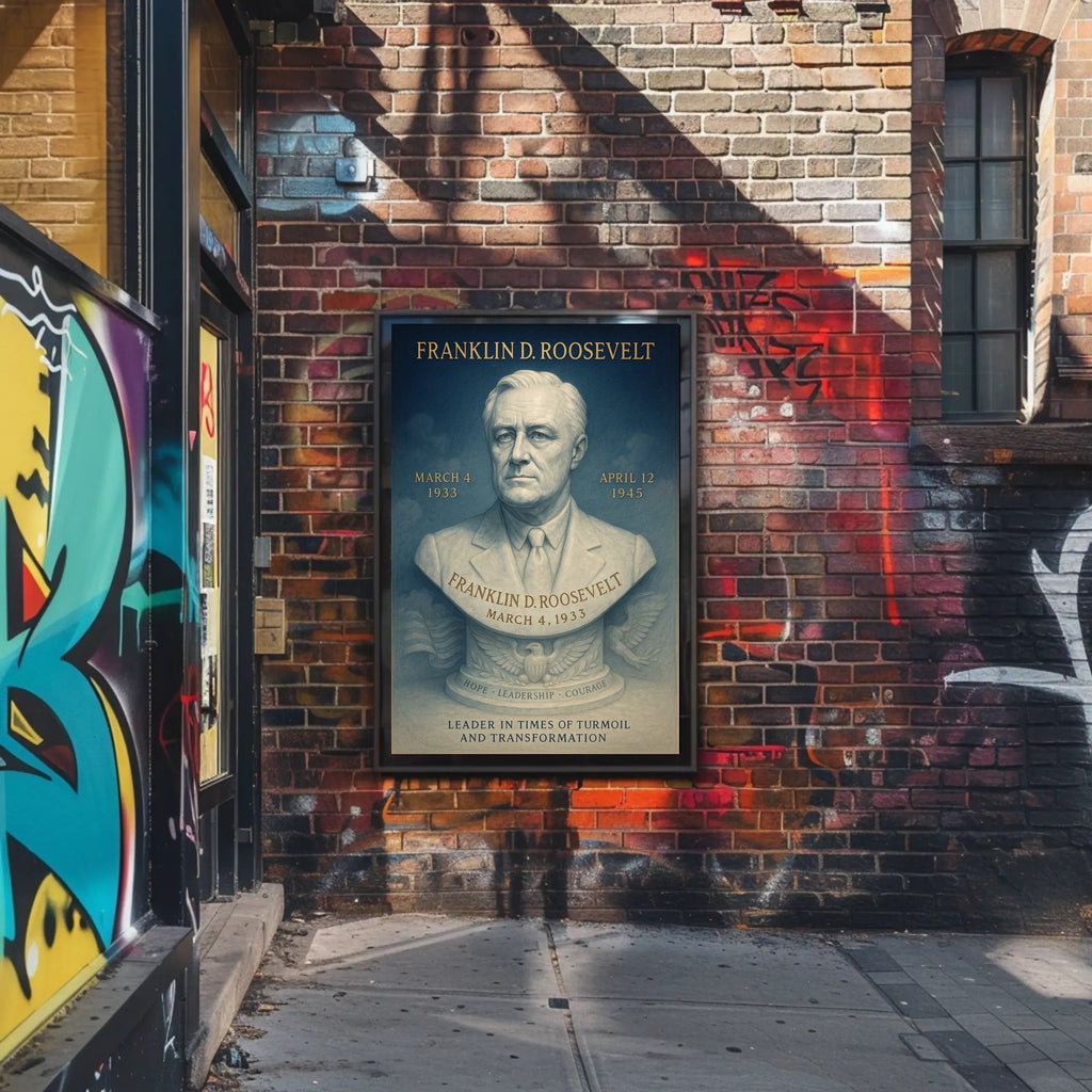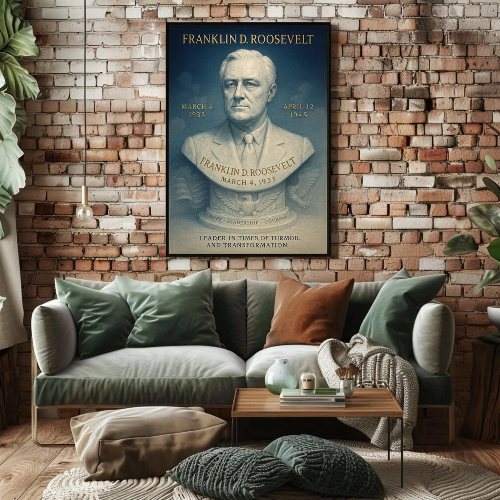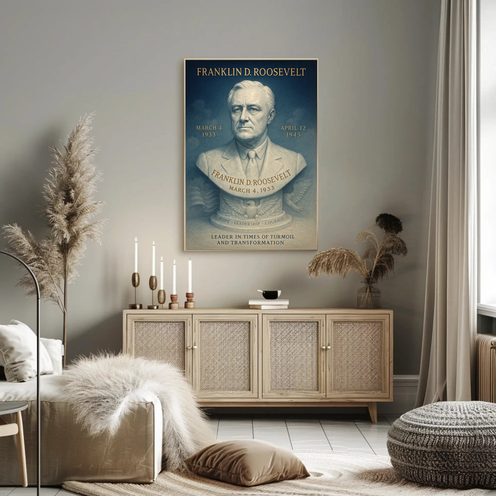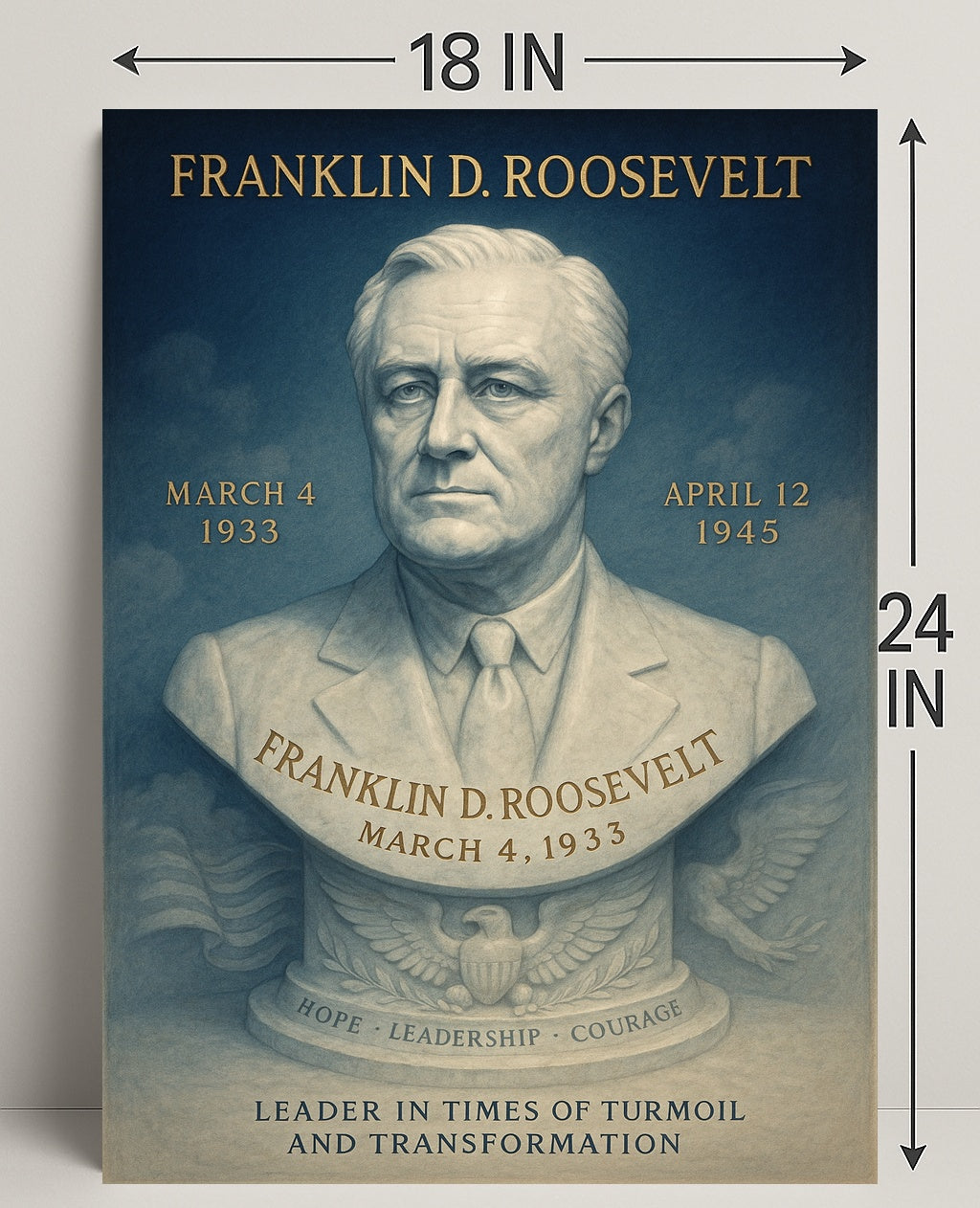 Enhance your living space with the captivating Franklin D. Roosevelt Poster. This stunning art print not only showcases the iconic figure of FDR but also adds a charming touch to any room. Inspired by real-world scenery, this poster is perfect for decor lovers and those with a spirit of wanderlust. Elevate your home or office with a piece that symbolizes hope, leadership, and courage.