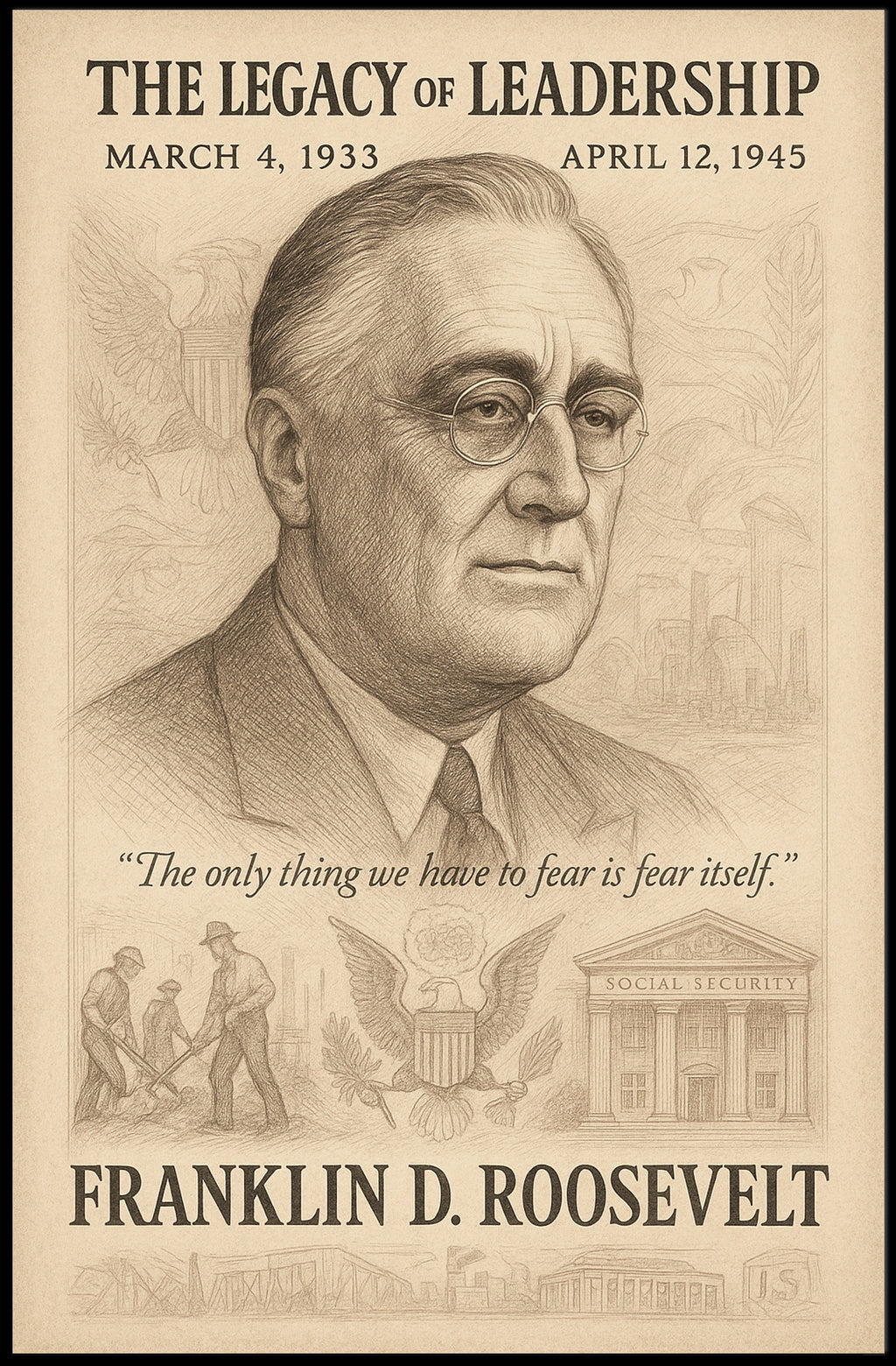Iconic imagery: Prominent portrait of Franklin D. Roosevelt with the memorable quote, "The only thing we have to fear is fear itself," surrounded by symbolic scenes that celebrate leadership and legacy.