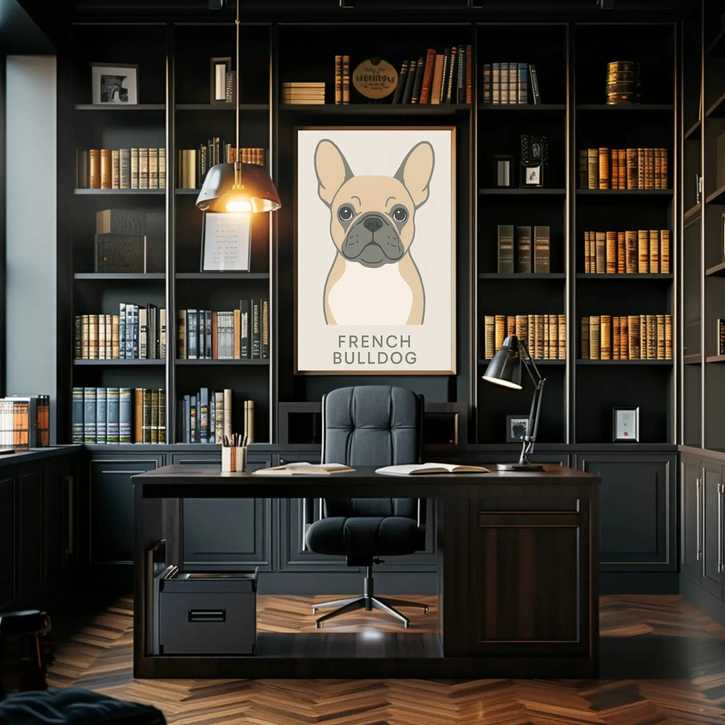 High-impact composition: Center-focused portrait with bold typography reading “FRENCH BULLDOG” for instant recognition and graphic appeal.