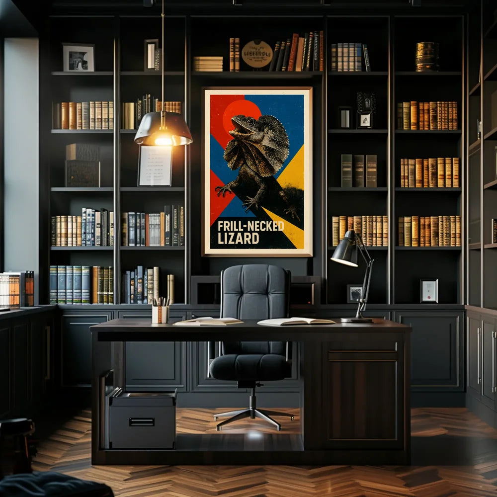 Whether you’re a fan of graphic design, modern art, nature art, or pop art influences, this poster’s bold, stylized design celebrates the frill-neck lizard in a way that’s both educational and visually striking. It’s an ideal addition to any space that values wildlife, evolution, and the beauty of adaptation, with a desert landscape-inspired feel that complements earthy tones and dynamic accents.