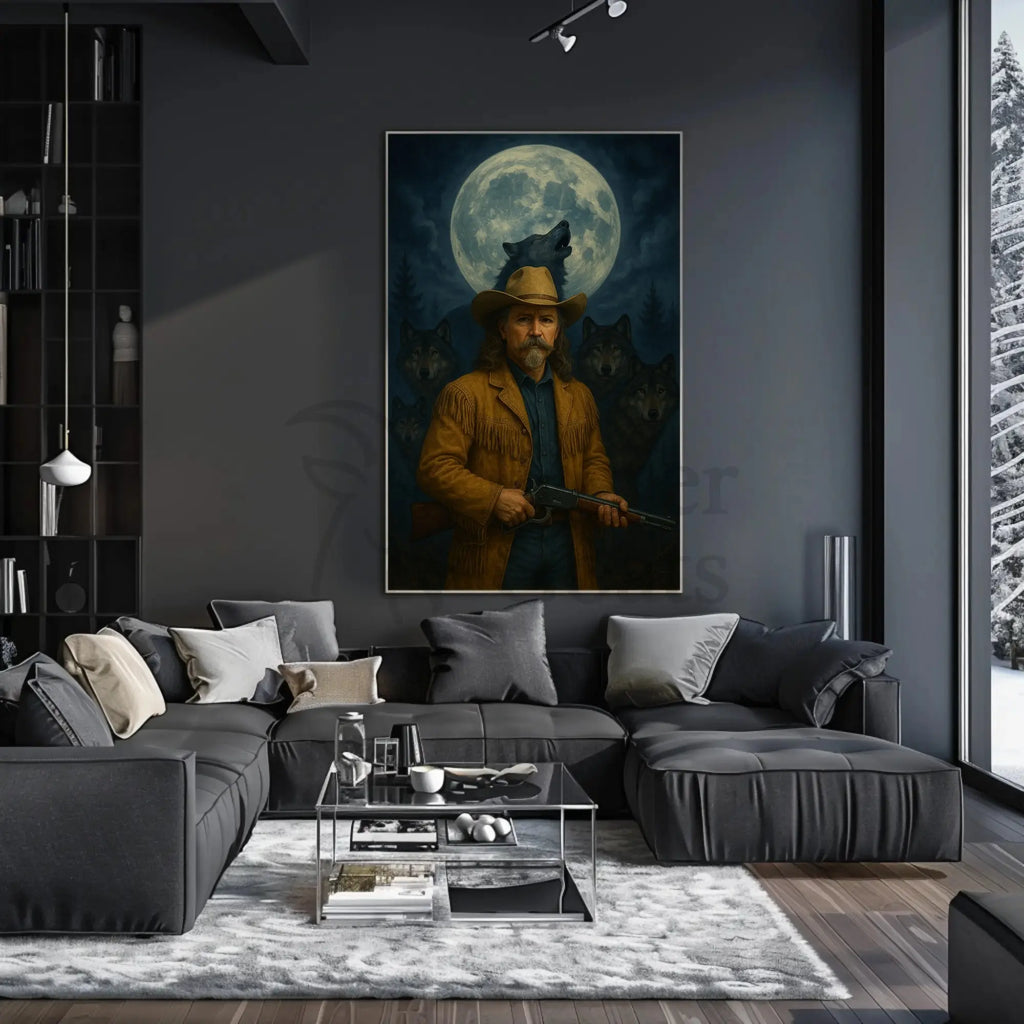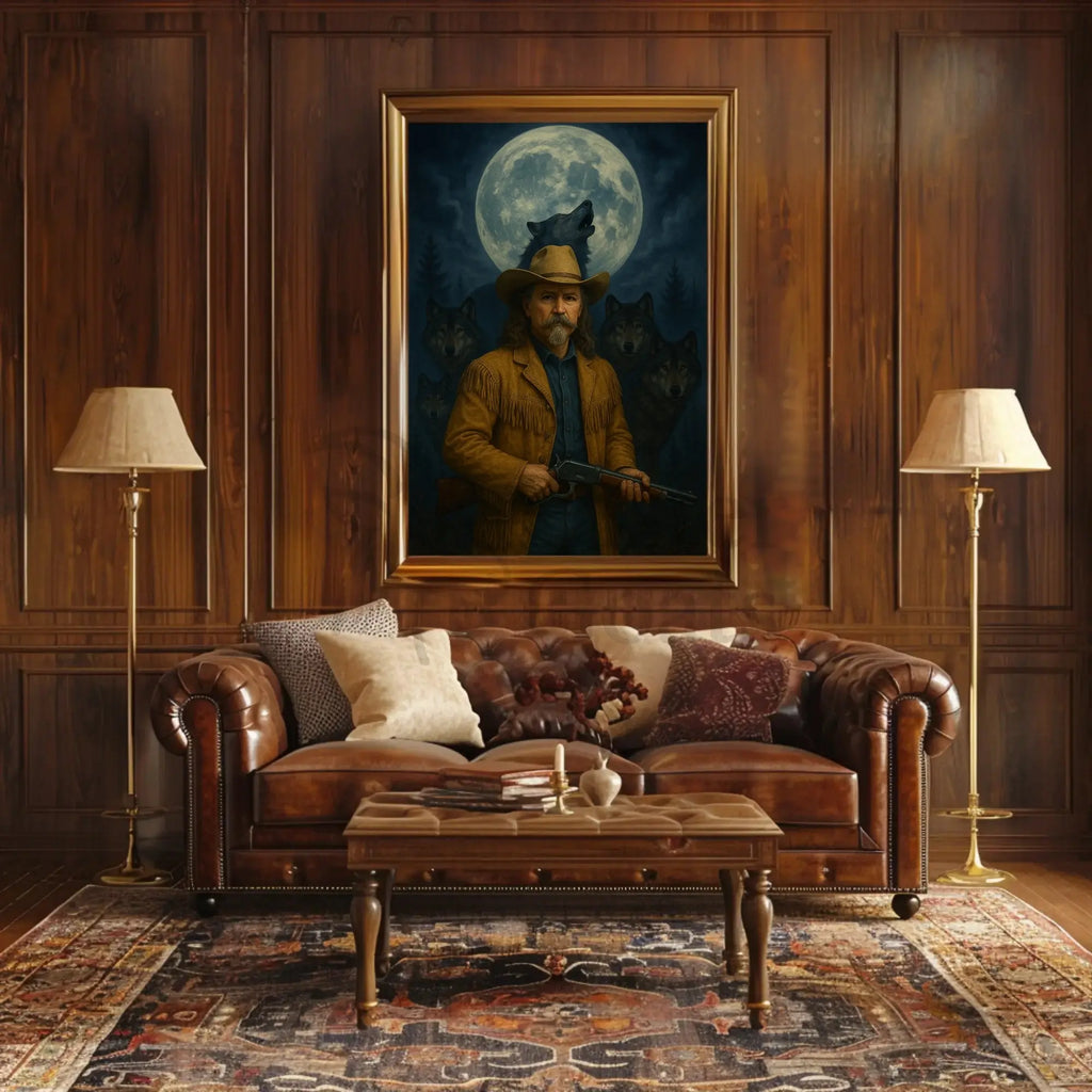 Step into the moonlit wilderness of the American frontier with this captivating poster, where rustic charm meets the untamed spirit of the West. Featuring a rugged cowboy clad in fringed attire, holding a rifle against a backdrop of howling wolves and a luminous moon, this artwork evokes the essence of late 1800s pioneering life. Its atmospheric blend of dark blues and browns creates a dramatic, mystical mood that reflects the deep connection between humans and nature. Perfect for history enthusiasts and nature lovers, this piece is a striking homage to rugged individualism and frontier heritage.