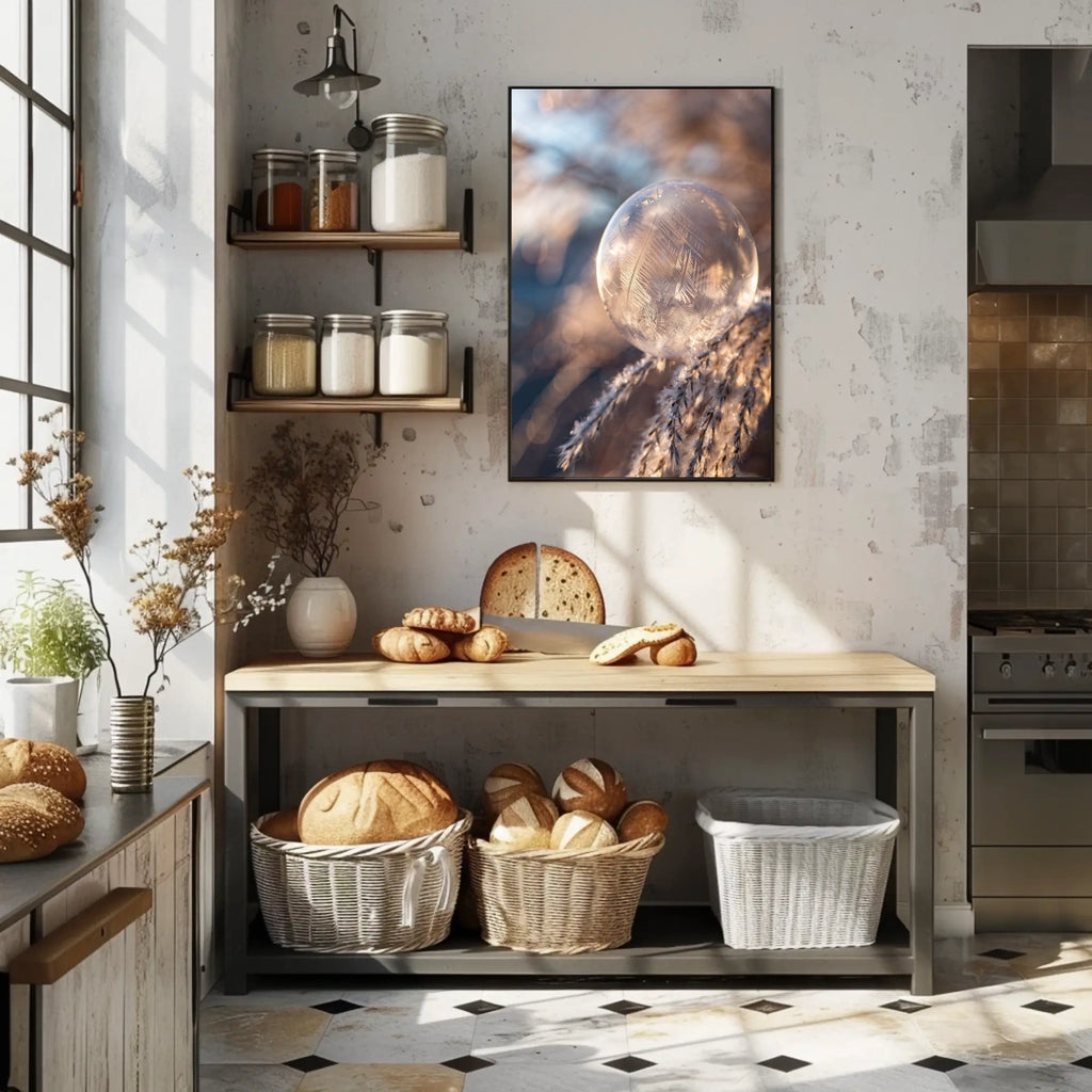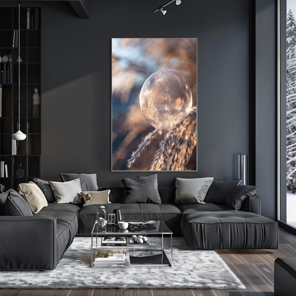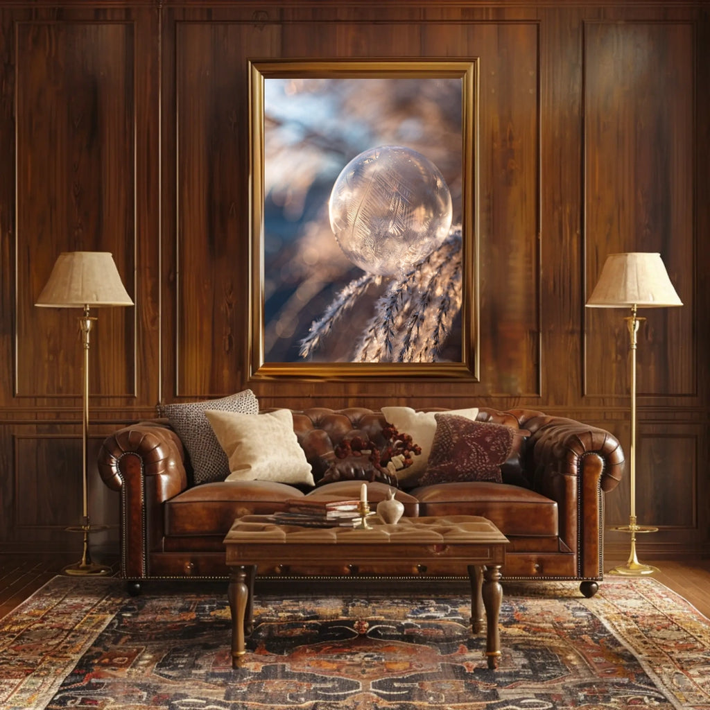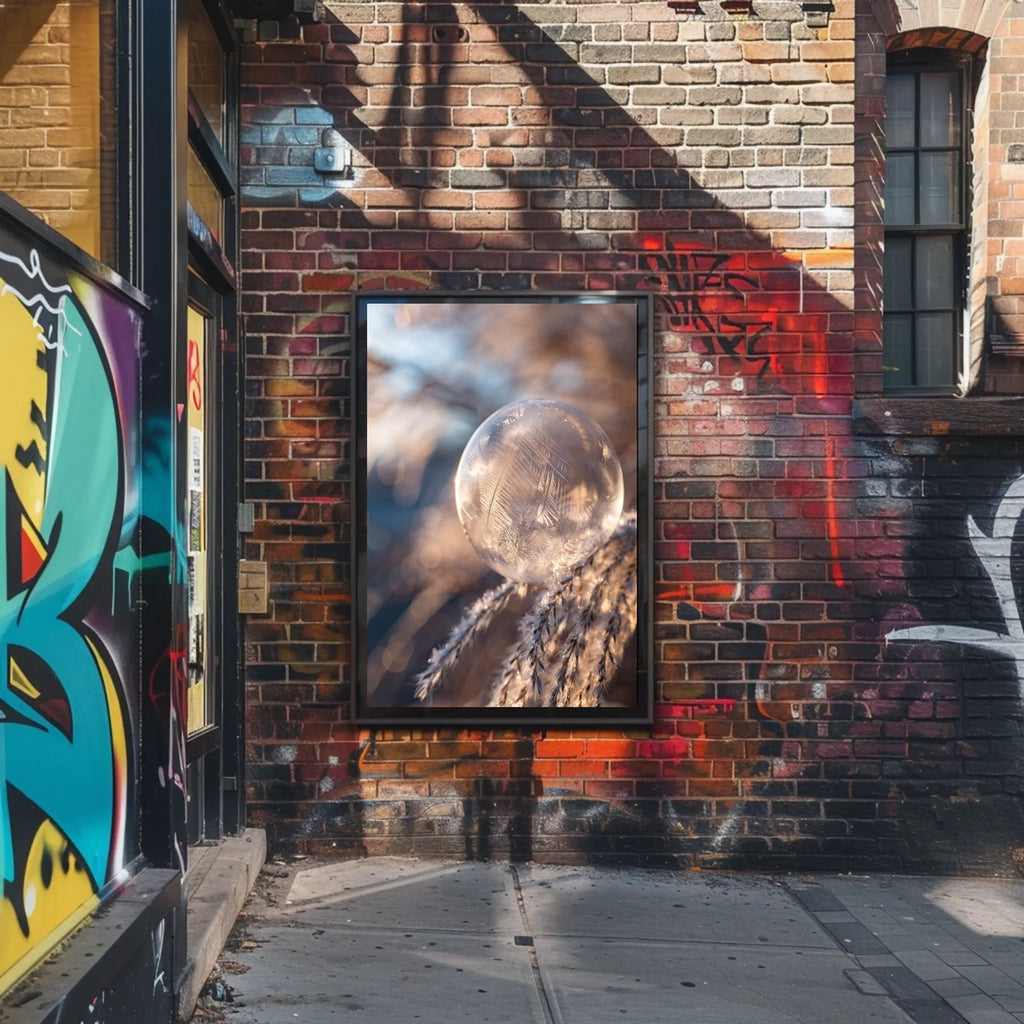 The poster showcases a frozen bubble perched delicately on frosty plant stems, captured in a photorealistic style that highlights intricate ice crystals shimmering in the soft, warm hues of sunrise light. The gentle contrast between the bubble's detailed textures and the cool, blurred background creates a dreamy, ethereal atmosphere that invites quiet reflection on winter's natural wonders. Perfect for fans of abstract poster art, the winter decor aesthetic, and fine art photography.