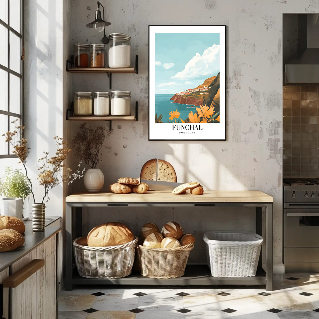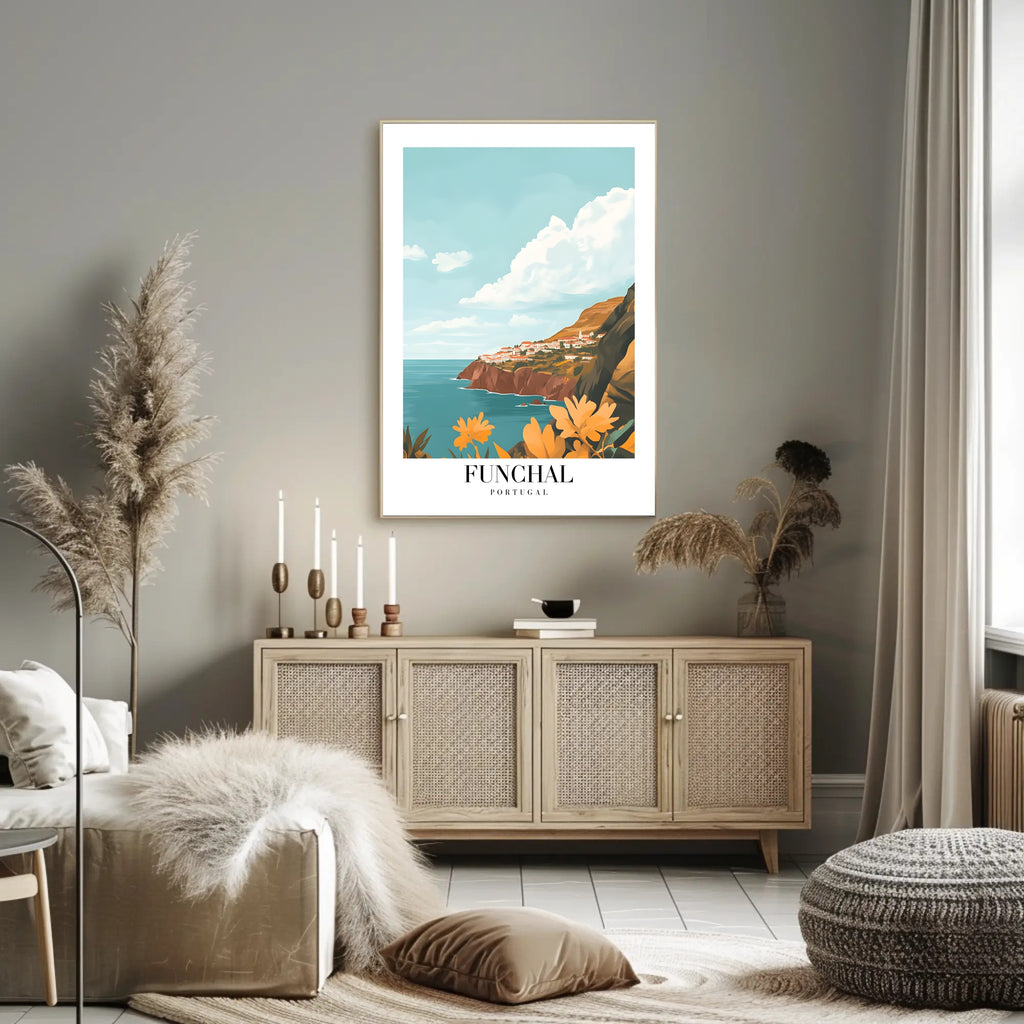 Discover the captivating beauty of Funchal, a vibrant coastal city in Portugal, with this stunning travel poster. This picturesque artwork beautifully captures the essence of Madeira Island, offering a scenic vista of colorful buildings nestled on a hillside overlooking calm ocean waters and majestic rugged cliffs. In the foreground, vibrant yellow flowers add a touch of natural elegance and charm. This poster evokes a sense of wanderlust, inviting viewers to embark on an idyllic journey to this enchanting destination. Perfect for travel enthusiasts and decor aficionados, it adds a touch of escapism to any space.