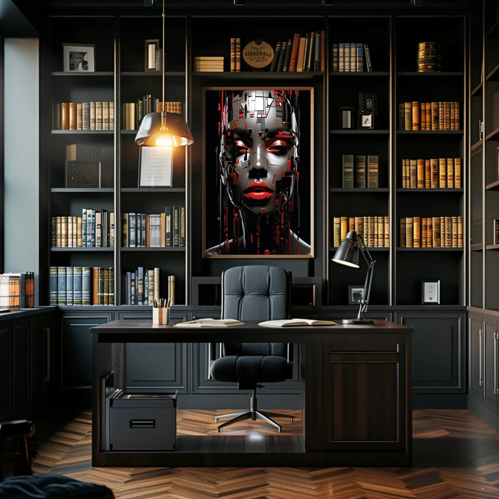 Dive into the realm of digital artistry with this striking poster, a futuristic abstract face that sits at the crossroads of cyborg art and contemporary art print. The composition blends modern art and technology, featuring a human-like visage crafted from fragmented, mirror-like shapes. Metallic and bold red tones dominate the design, creating a mosaic-style depth that draws the eye. Glossy red lips and serene closed eyes serve as focal points, enhancing the piece's sleek, high-tech appeal. With its avant-garde and slightly mysterious aura, this artwork is perfect for those who appreciate bold, dramatic, and thought-provoking decor.
