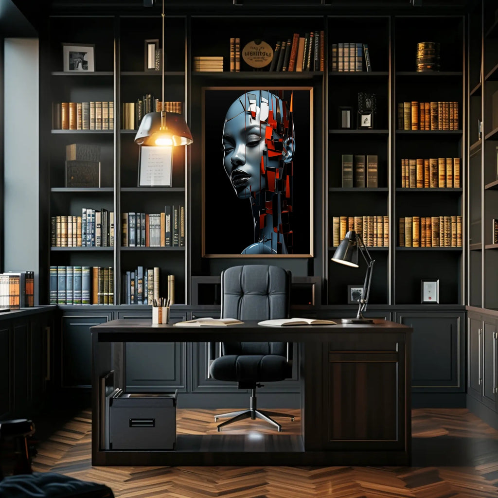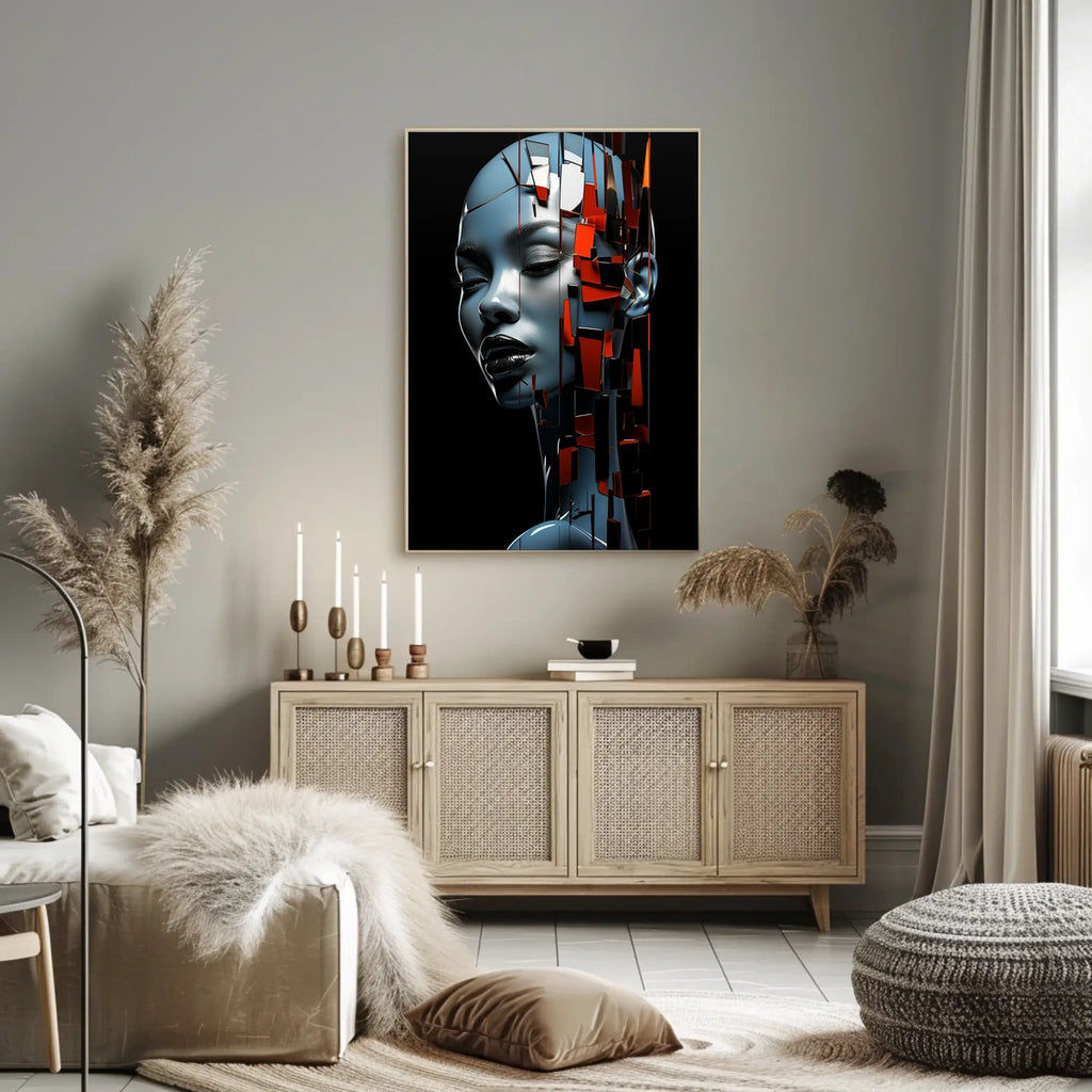 Ideal for collectors, enthusiasts, and spaces seeking a bold focal point, this abstract poster blends AI art with geometric shapes and a metallic finish to evoke the human technology convergence and the modern surrealism of contemporary design. A perfect addition to contemporary wall art and tech-inspired decor collections.
