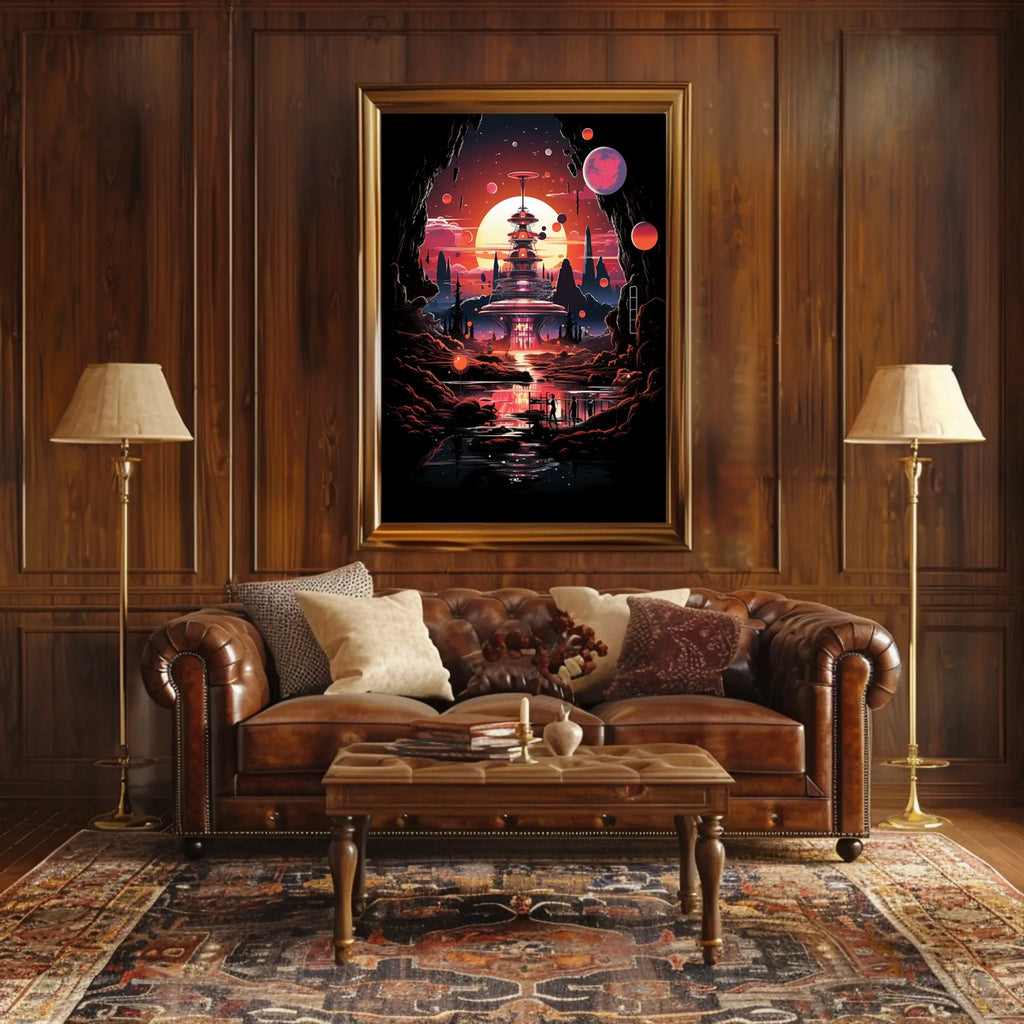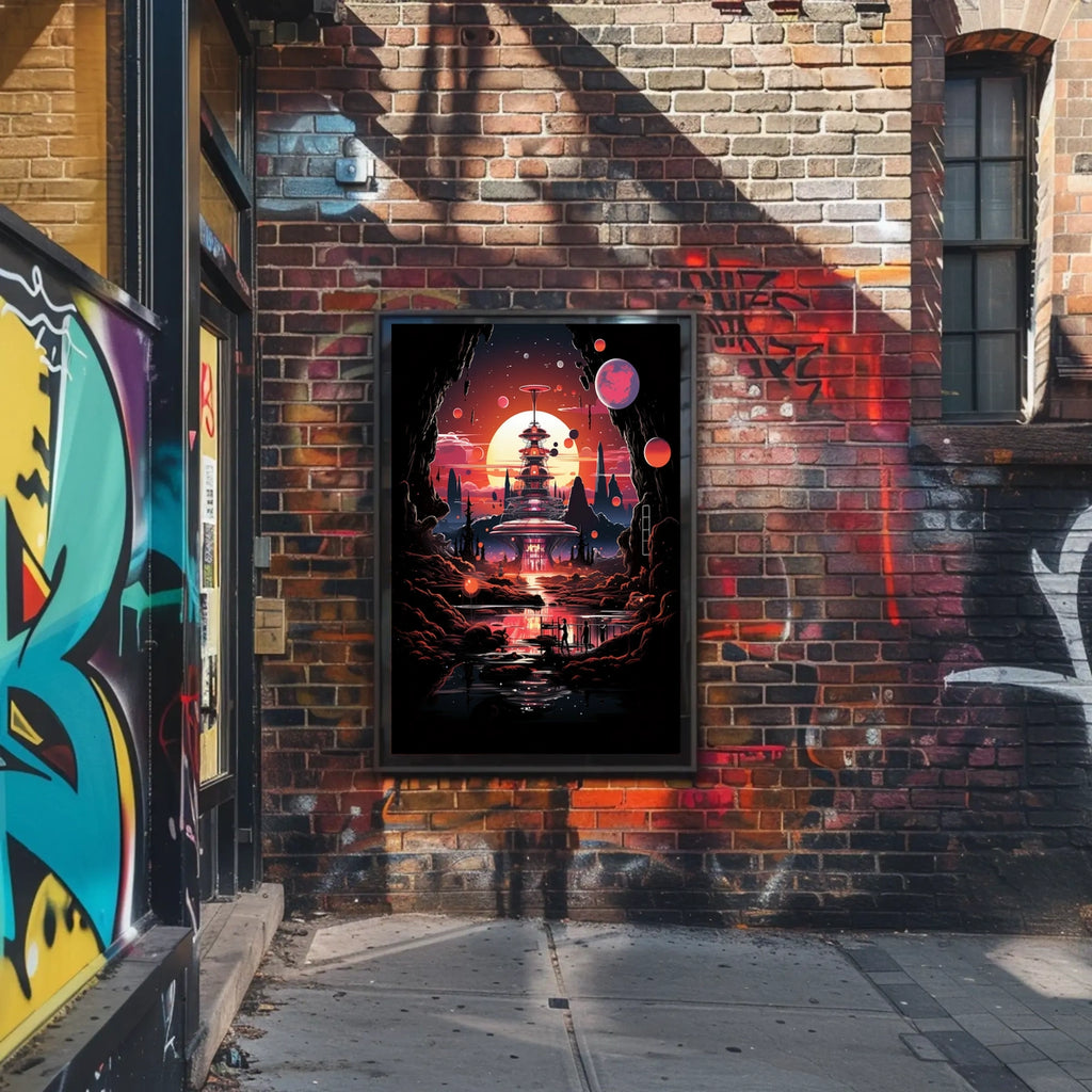 Immerse yourself in a visionary world with the Futuristic Alien Landscape Sci-Fi Poster. This stunning wall art depicts an alien landscape featuring advanced architecture and sleek structures set against cosmic vistas, inviting you to dream of otherworldly adventures. The intricate design captures the essence of a distant future or extraterrestrial civilization, making it perfect for sci-fi enthusiasts, futurists, and dreamers alike. The vivid colors and meticulous details transform your space into a gateway to new realms.