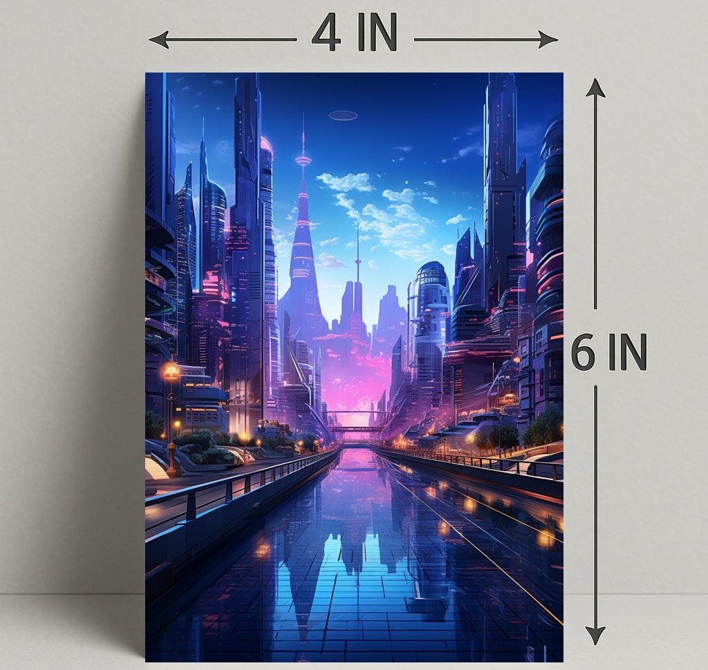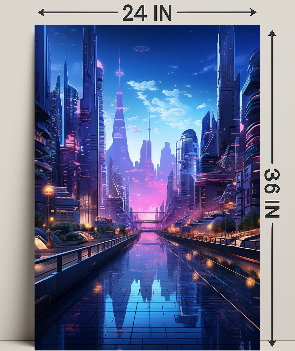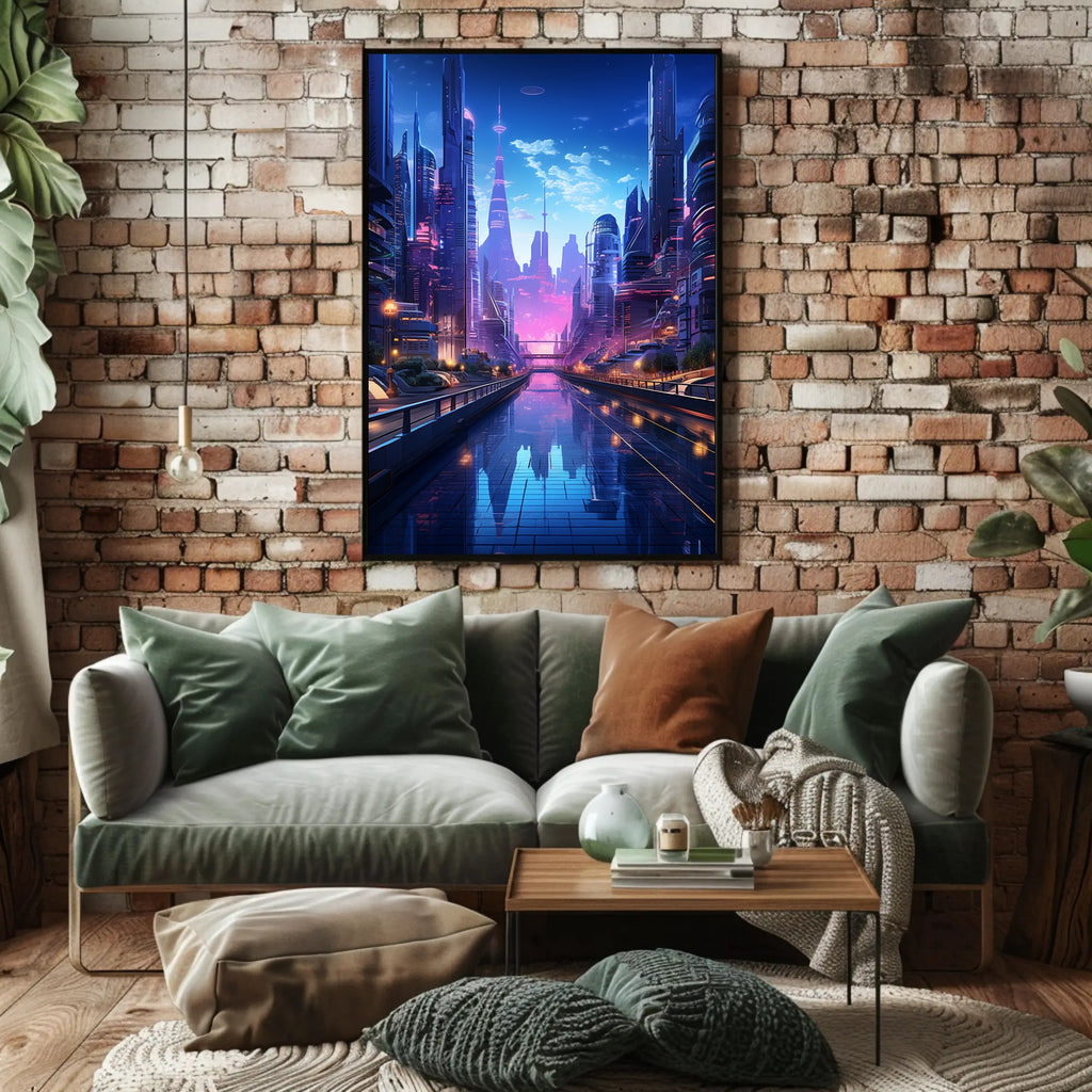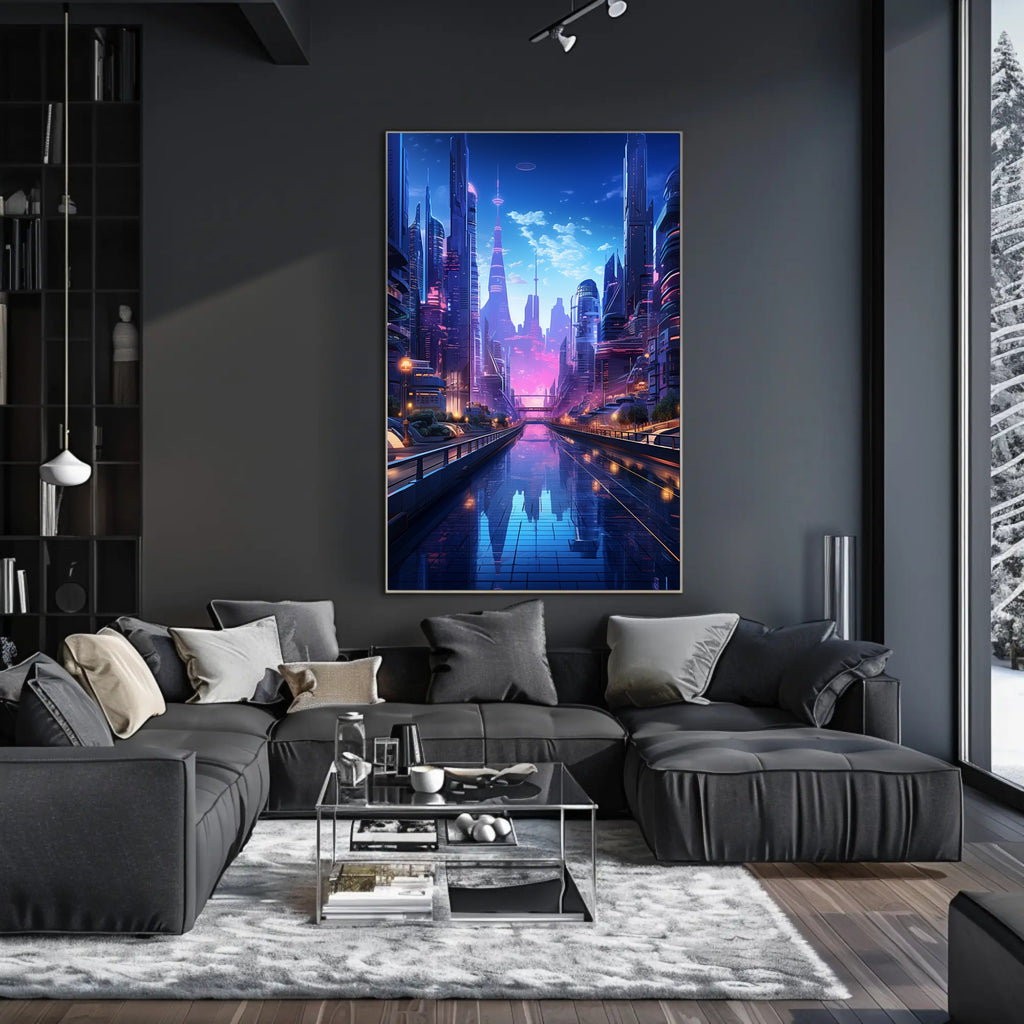 The artwork features a panoramic urban canyon framed by sleek towers, glowing bridgeways and a mirror-like canal that reflects the skyline — a dramatic composition that draws the eye and sparks imagination. Its rich blues, magentas and subtle warm lights make it an ideal focal point for living rooms, offices, gaming rooms or studios.
