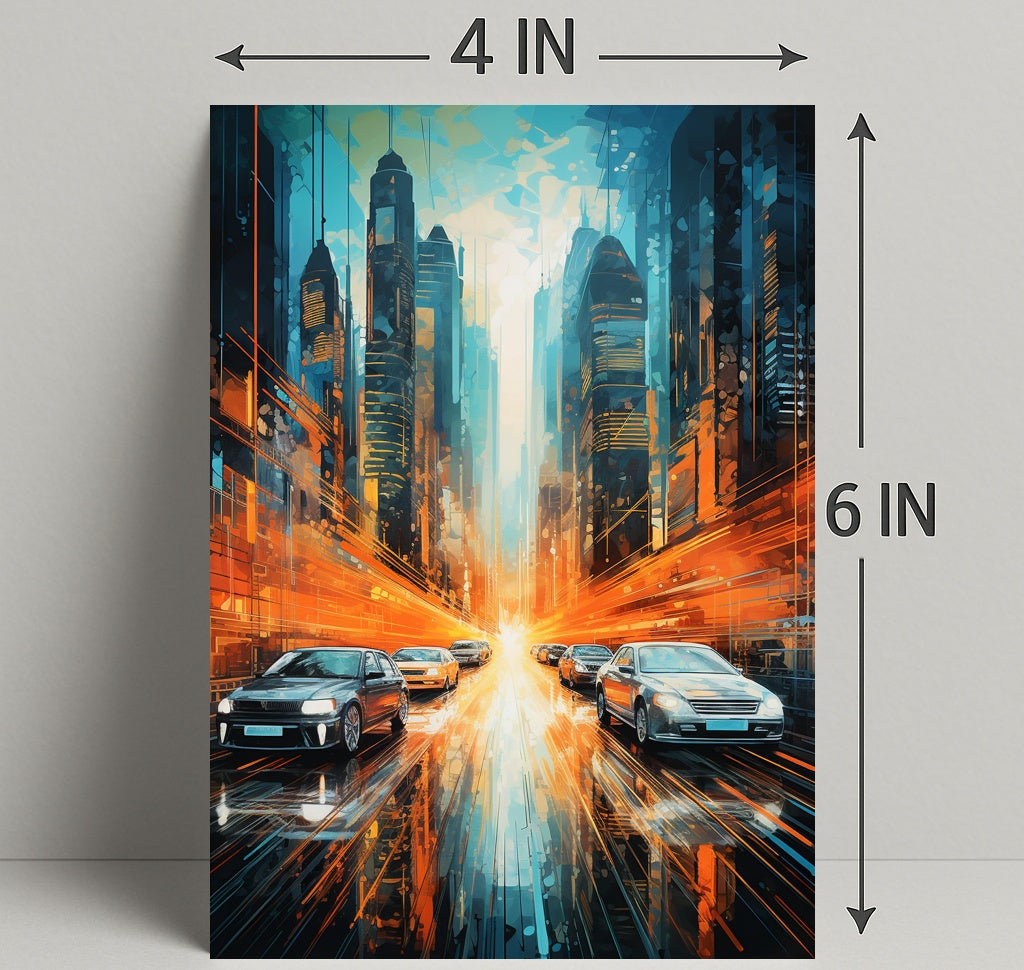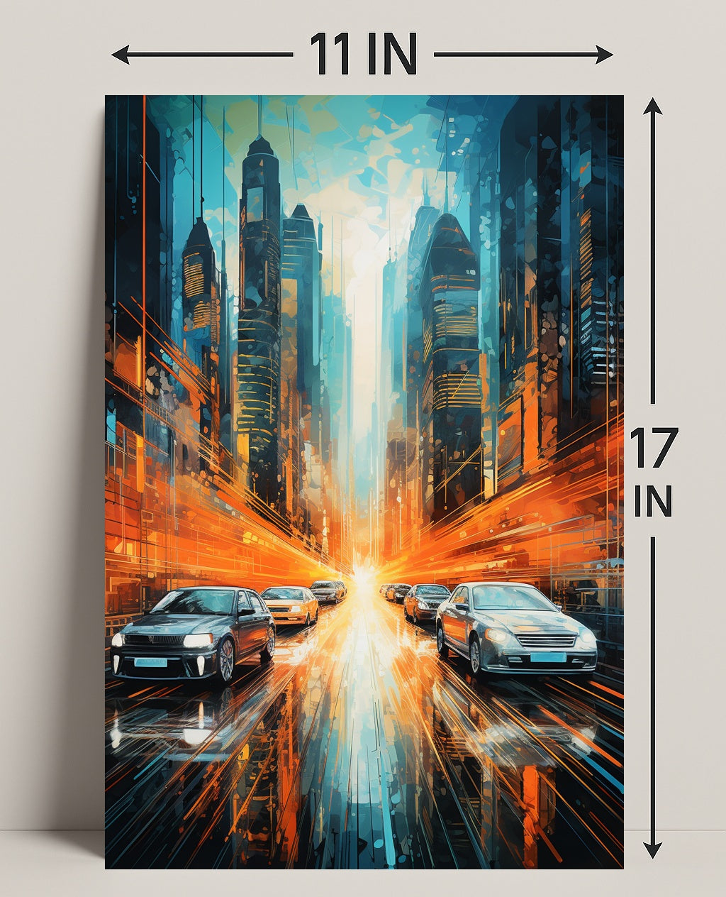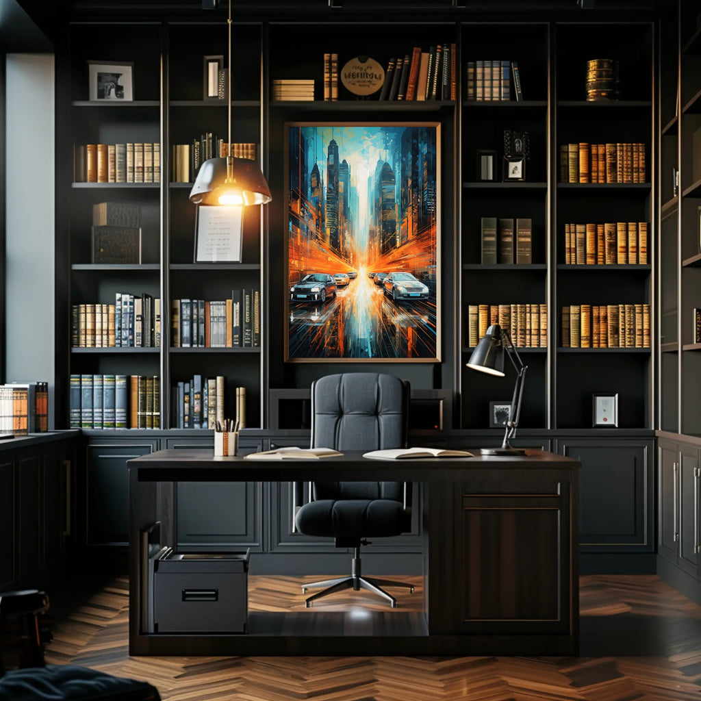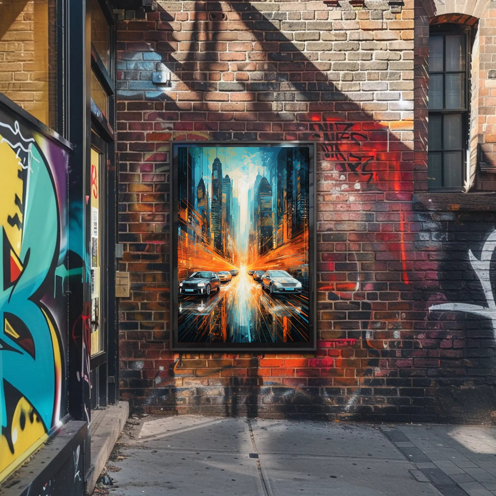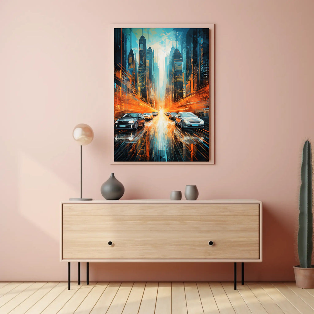 This poster captures a dynamic urban corridor framed by towering, futuristic skyscrapers in cool teal and deep navy tones, contrasted by explosive orange light trails that streak across the wet reflective street. Sleek cars glide toward a luminous vanishing point, while layered geometric brushstrokes and glossy reflections add depth and motion — a perfect match for minimalist, contemporary, and travel-inspired interiors.