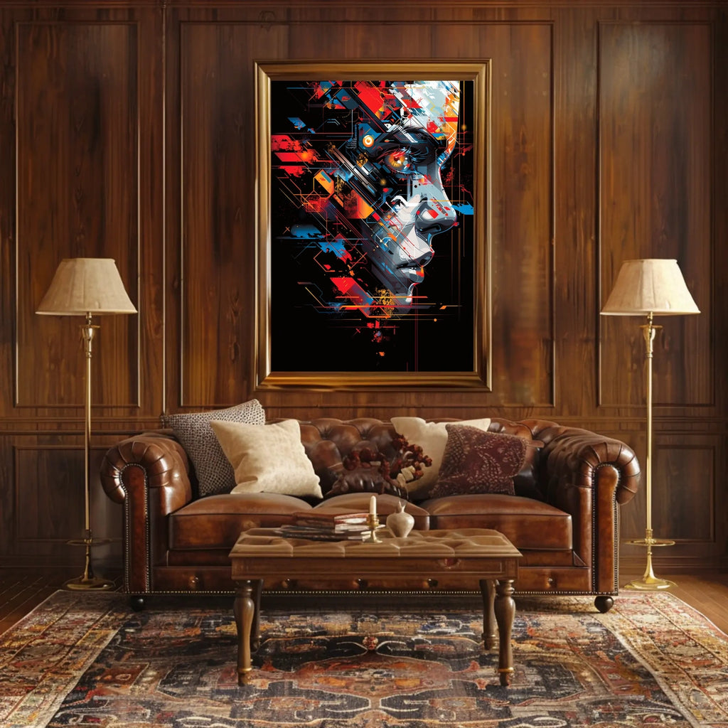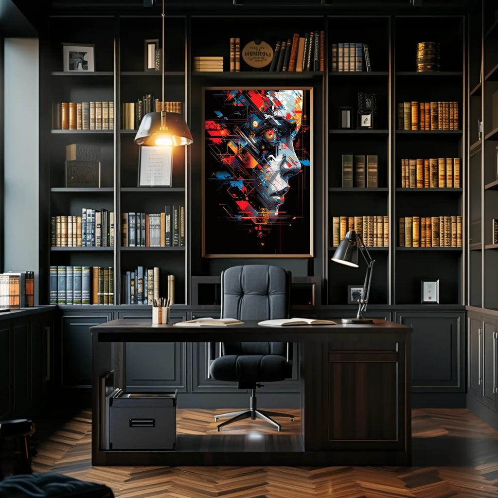 This bold, high-tech poster blends cyberpunk art aesthetics with digital integration, creating a striking focal point for modern spaces. The vibrant colors and crisp patterns evoke a futuristic flair that complements contemporary interiors, classrooms, or workspaces. Perfect for fans of abstract geometric design and electronic circuits, it invites conversation and imagination.
