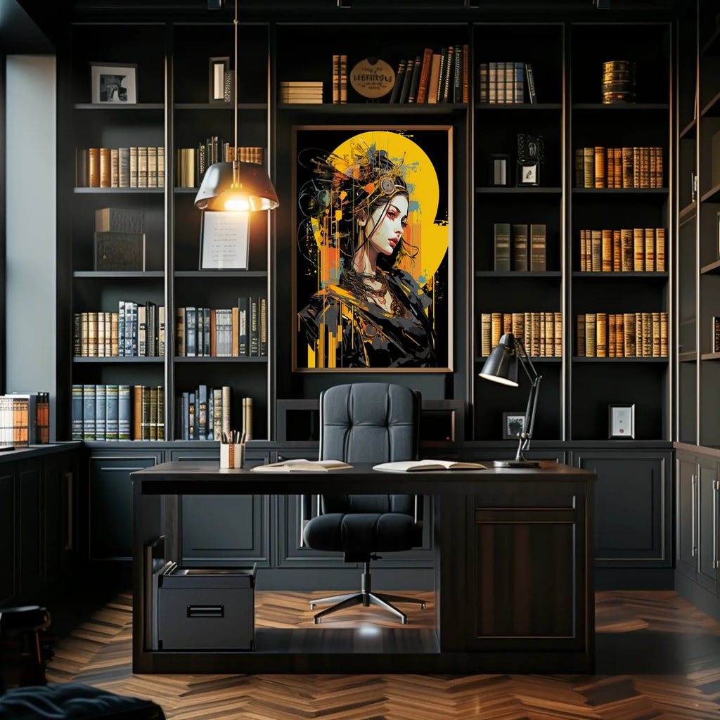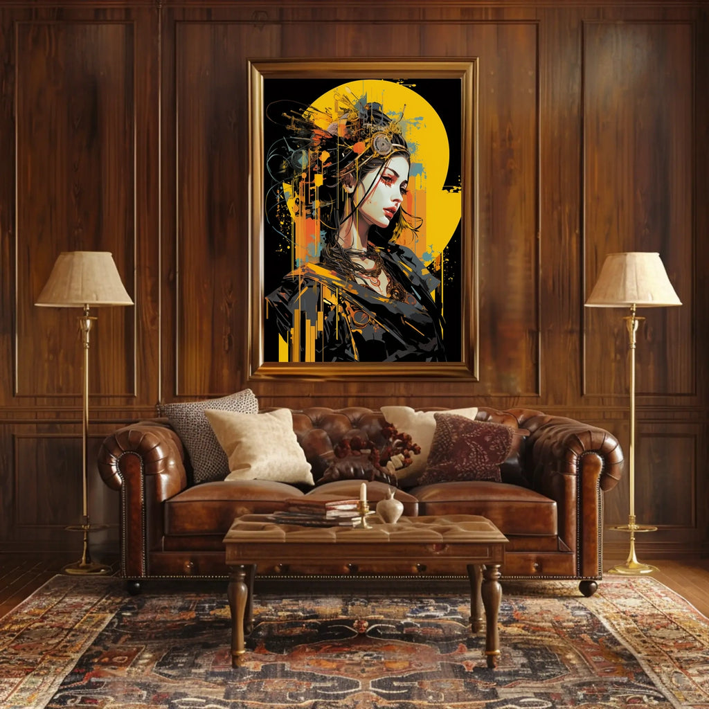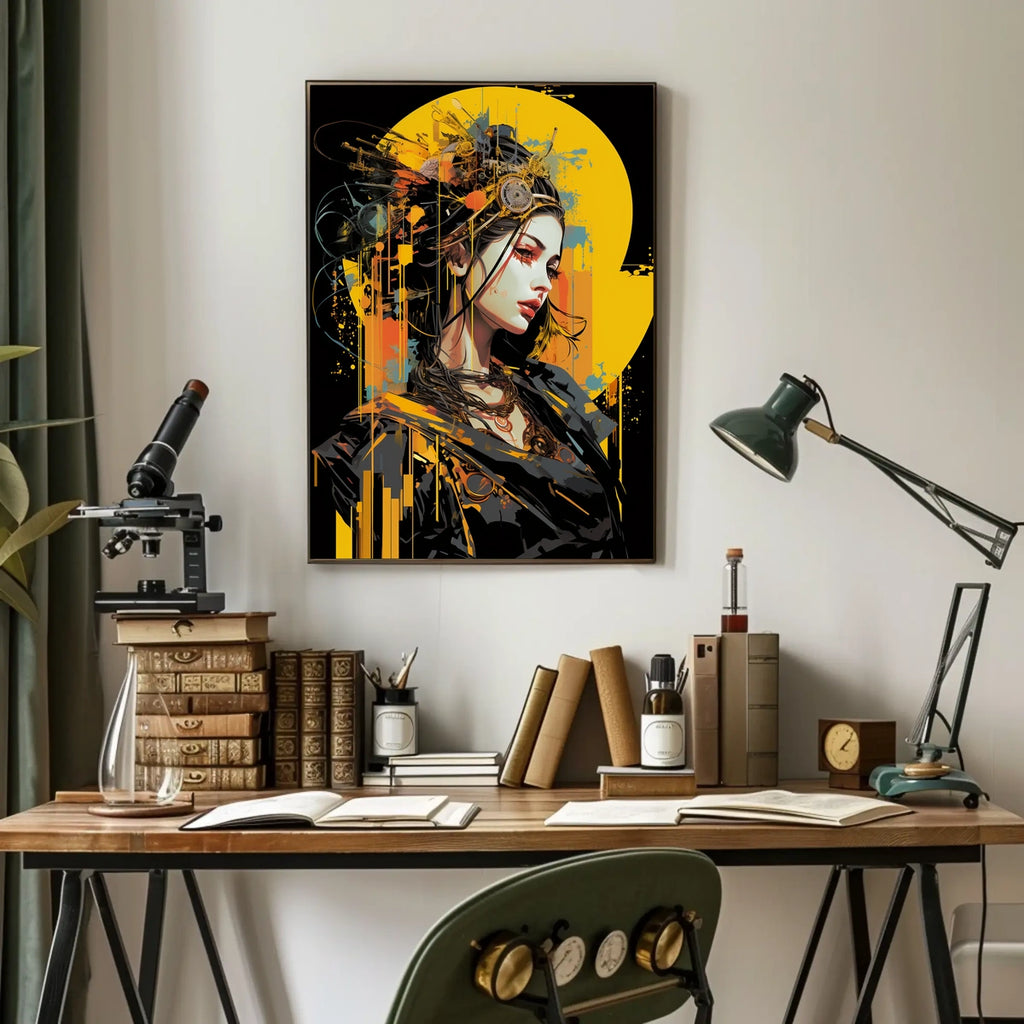 Immerse yourself in a world where the organic and mechanical seamlessly blend with this captivating futuristic portrait. The poster showcases a serene yet powerful woman adorned with intricate mechanical elements, embodying a perfect fusion of human and machine. Her vivid makeup and elaborate headgear of gears and wires create a striking contrast against her sleek, modern attire. The bold, vibrant splashes of yellow, orange, and blue enhance the sci-fi and cyberpunk vibe, making it a perfect addition to any contemporary art collection. This dynamic piece exudes innovation and elegance, appealing to fans of futuristic and abstract art.