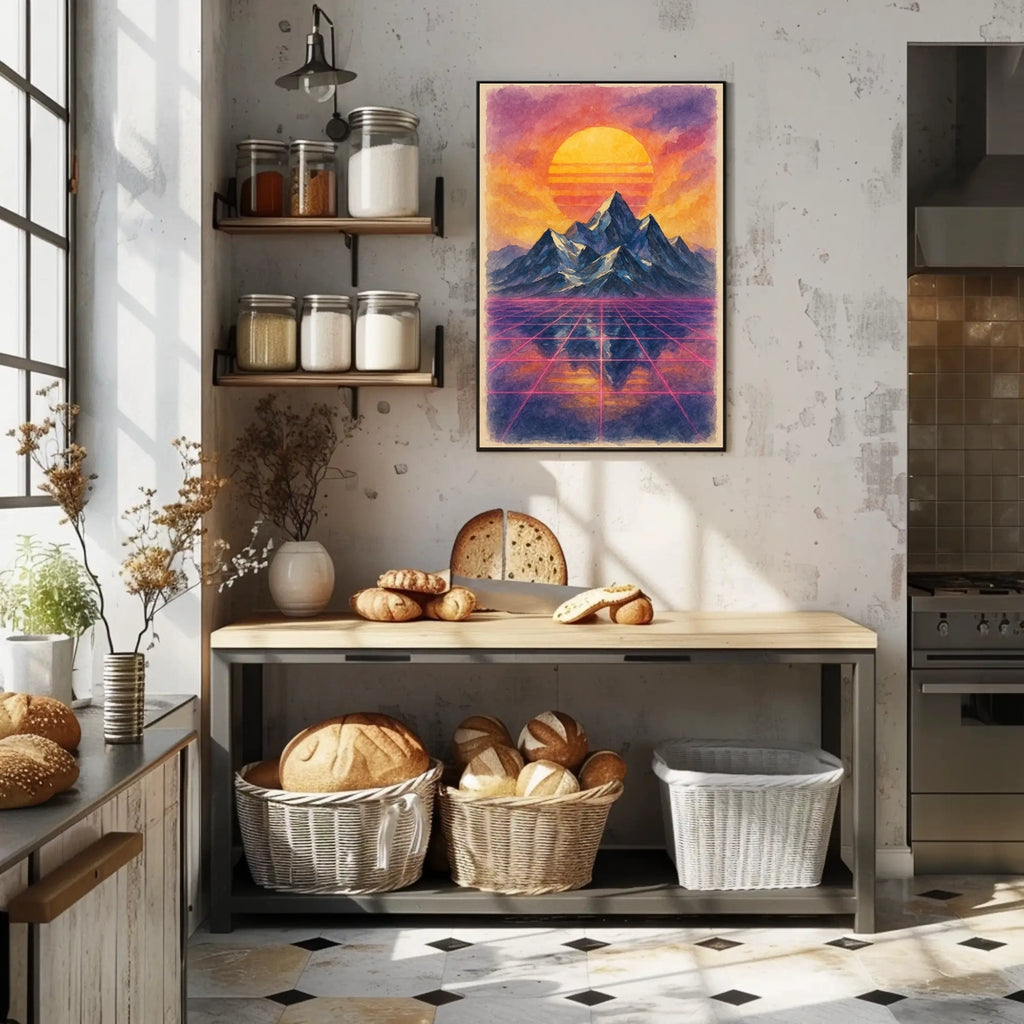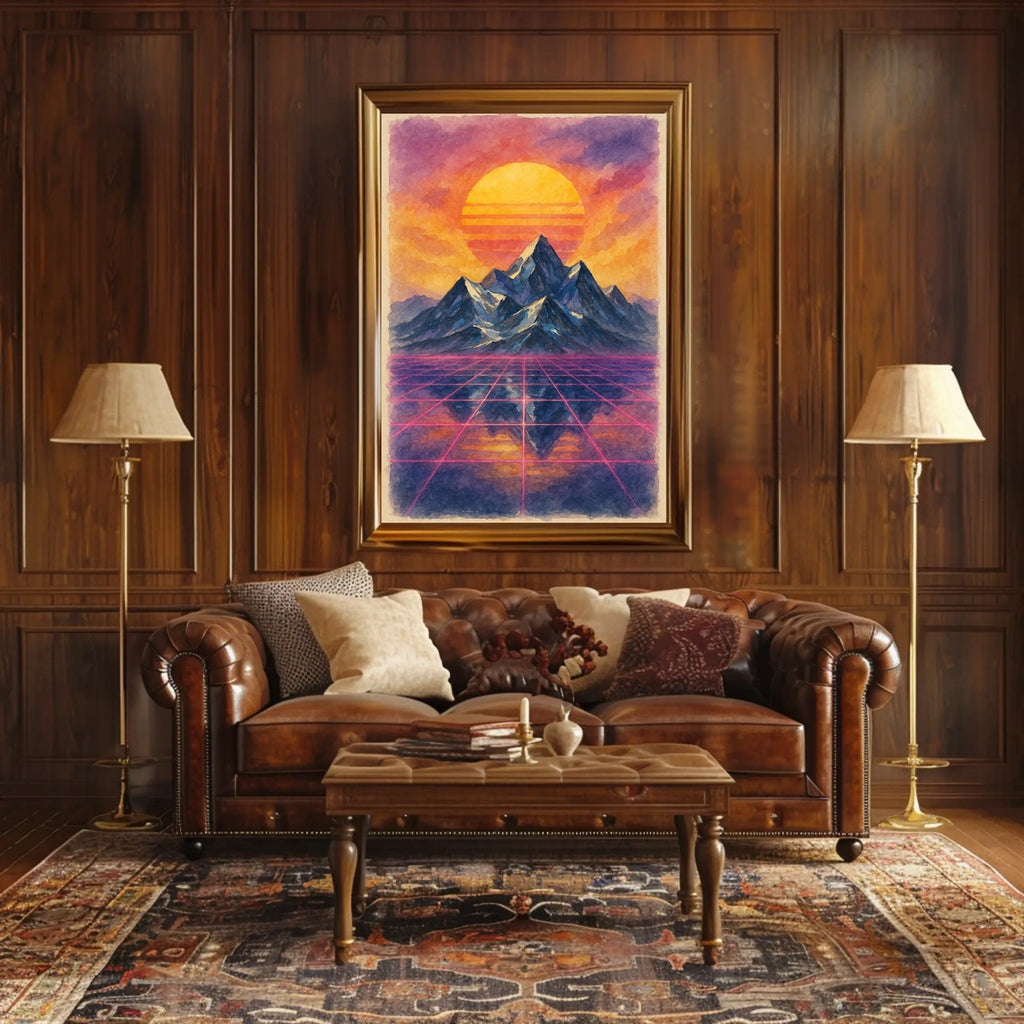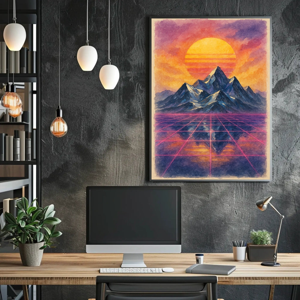 Immerse in a surreal vision featuring a series of snow-capped mountains, a colossal setting sun, and a reflective neon pink grid ground. The horizontal striped sun and the artistic watercolor texture elevate its dreamlike quality, creating an intriguing blend of nostalgia and futurism. Vibrant colors and an abstract grid pattern evoke the mysterious awe of 1980s-inspired design. Perfect for art enthusiasts and sci‑fi fans, this poster melds past and future aesthetics into a captivating visual experience.