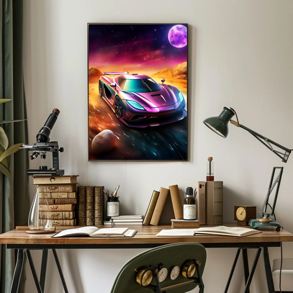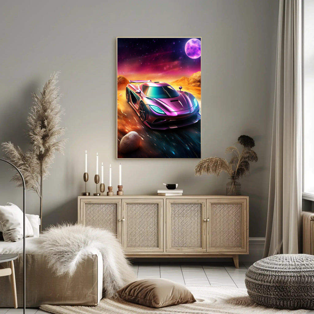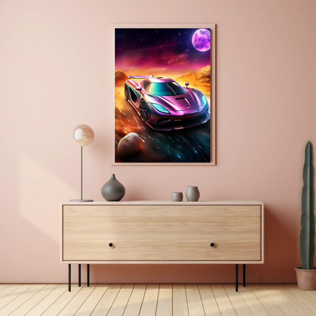 This poster showcases a hyper-detailed supercar rendered in iridescent purples and teals, racing across a cosmic, desert-like landscape under a glowing moon. The minimalist composition and dramatic color contrast create a dynamic visual impact that works beautifully in living rooms, offices, garages, or as a standout piece in curated gallery walls.
