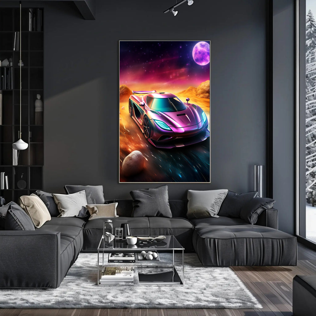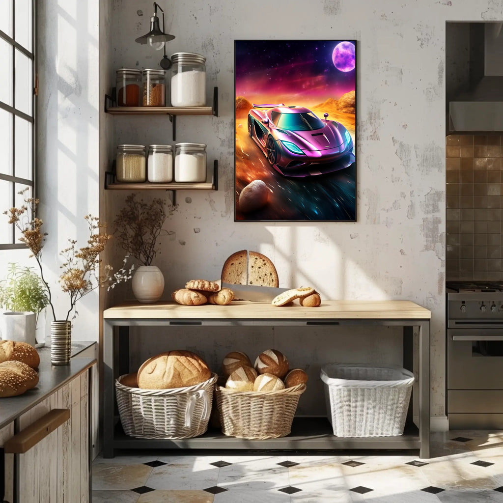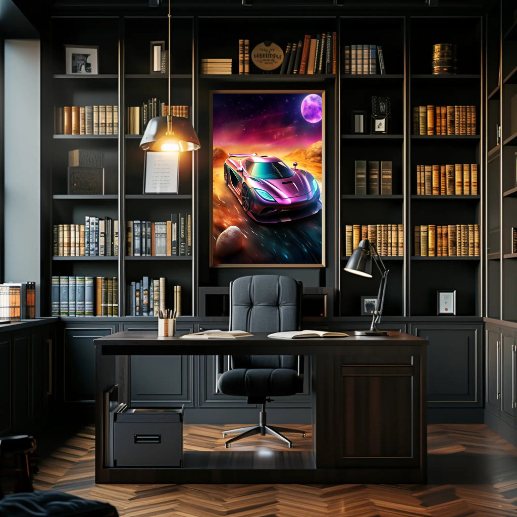 This poster showcases a hyper-detailed supercar rendered in iridescent purples and teals, racing across a cosmic, desert-like landscape under a glowing moon. The minimalist composition and dramatic color contrast create a dynamic visual impact that works beautifully in living rooms, offices, garages, or as a standout piece in curated gallery walls.