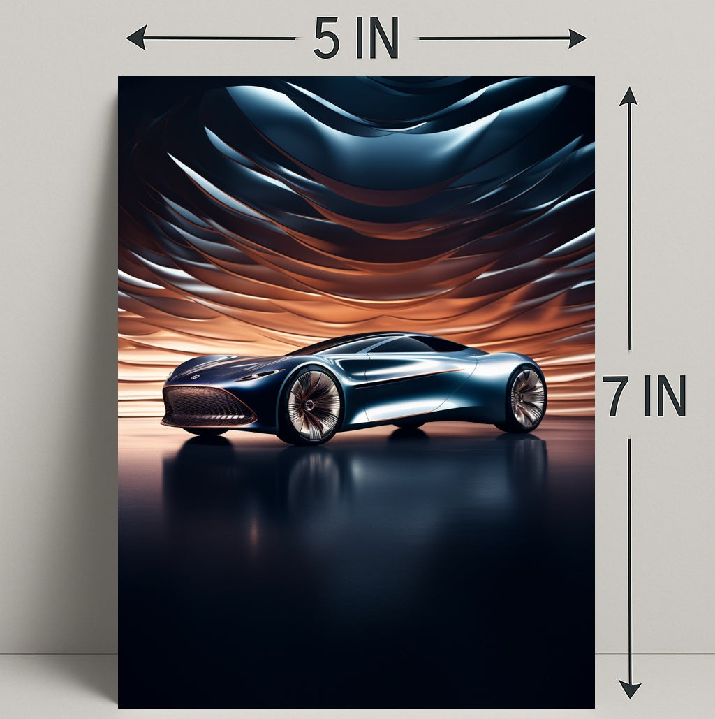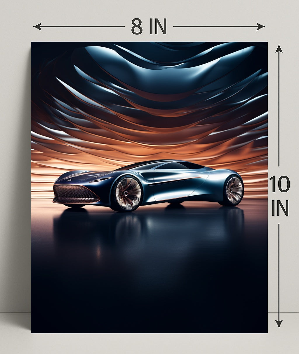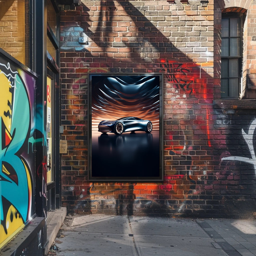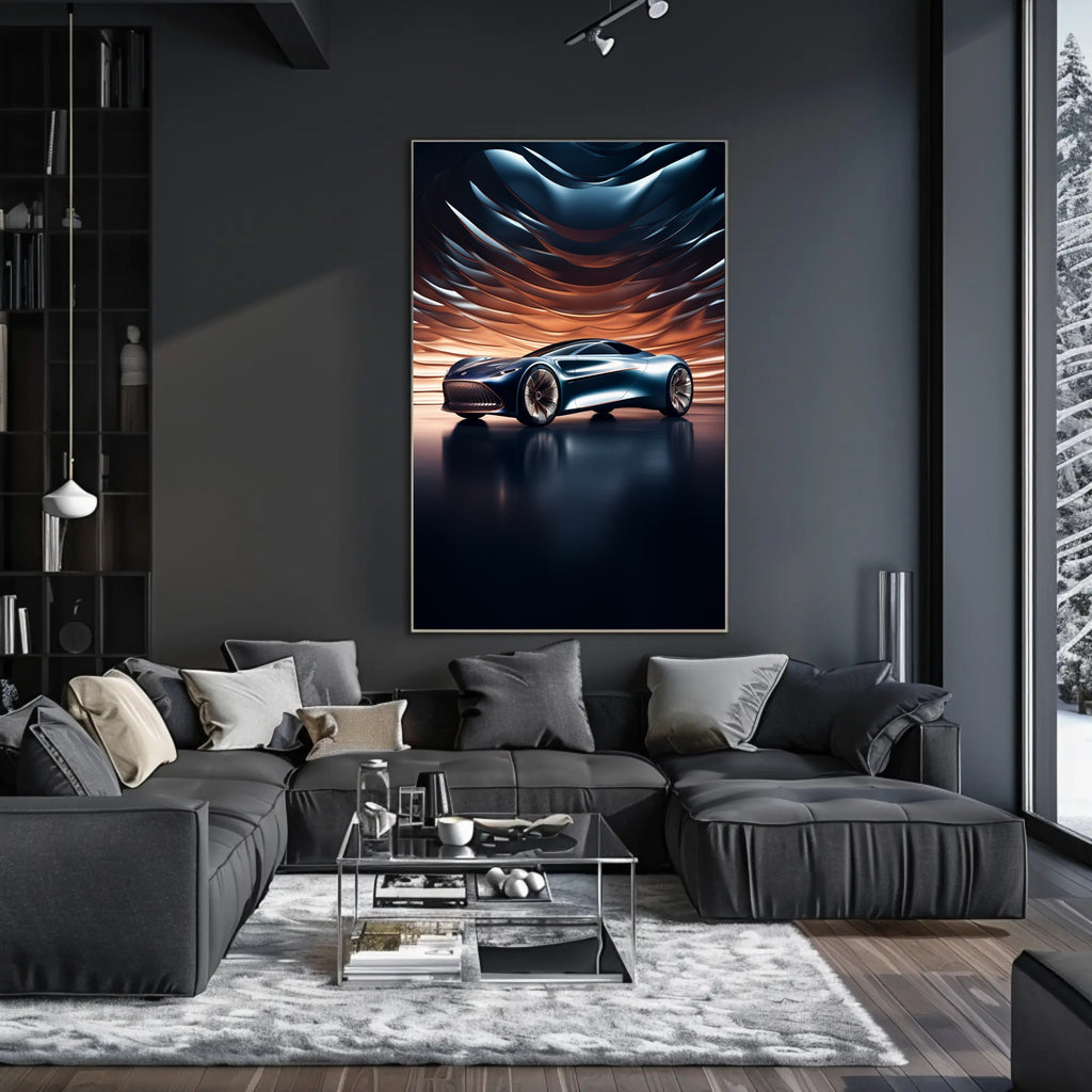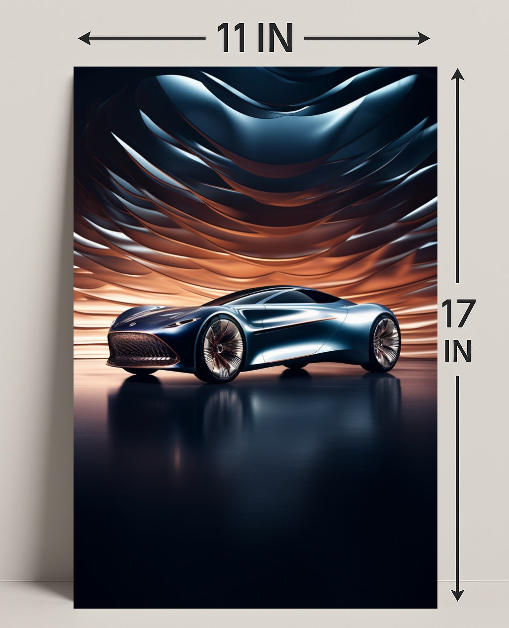 Futuristic Elegance by PosterGoat is a high-impact art poster that fuses sleek automotive design with sculpted, wave-like textures for a modern masterpiece. The print showcases a polished concept car set against a dynamic metallic backdrop in deep navy and warm copper highlights ā a striking focal point that elevates minimalist and contemporary interiors.