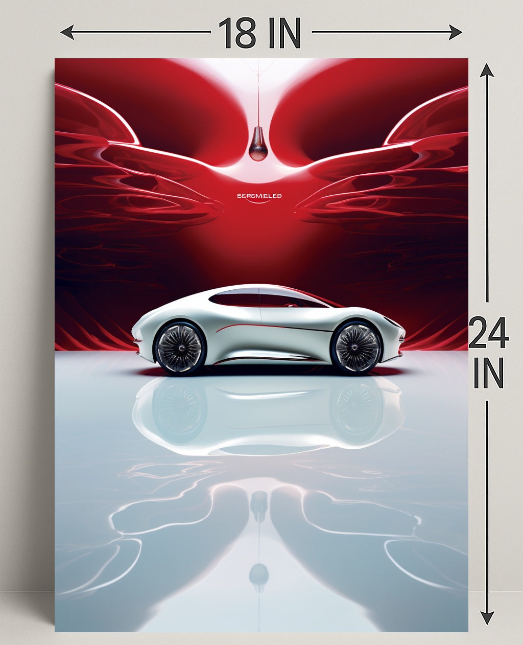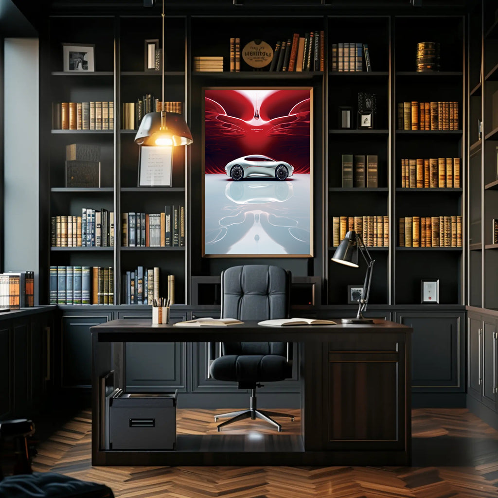Futuristic Elegance Poster from PosterGoat brings modern design and minimalist sophistication to any wall. This striking poster features a sleek, sculptural concept car rendered in pearlescent white, set against a deep red abstract backdrop and mirrored on a glossy reflective surface — a composition that captures movement, luxury, and futuristic flair.