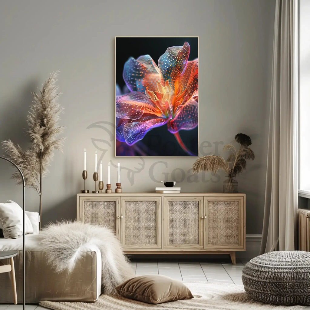 Bring a bold intersection of nature and technology into your home with the Futuristic Flower Art: Vibrant Sci‑Fi Poster from PosterGoat. This 18x24 poster captures a stylized digital bloom in striking neon hues—iridescent purples, fiery oranges and electric blues—outlined by delicate, luminous dot patterns that give the petals an almost holographic, three‑dimensional texture.