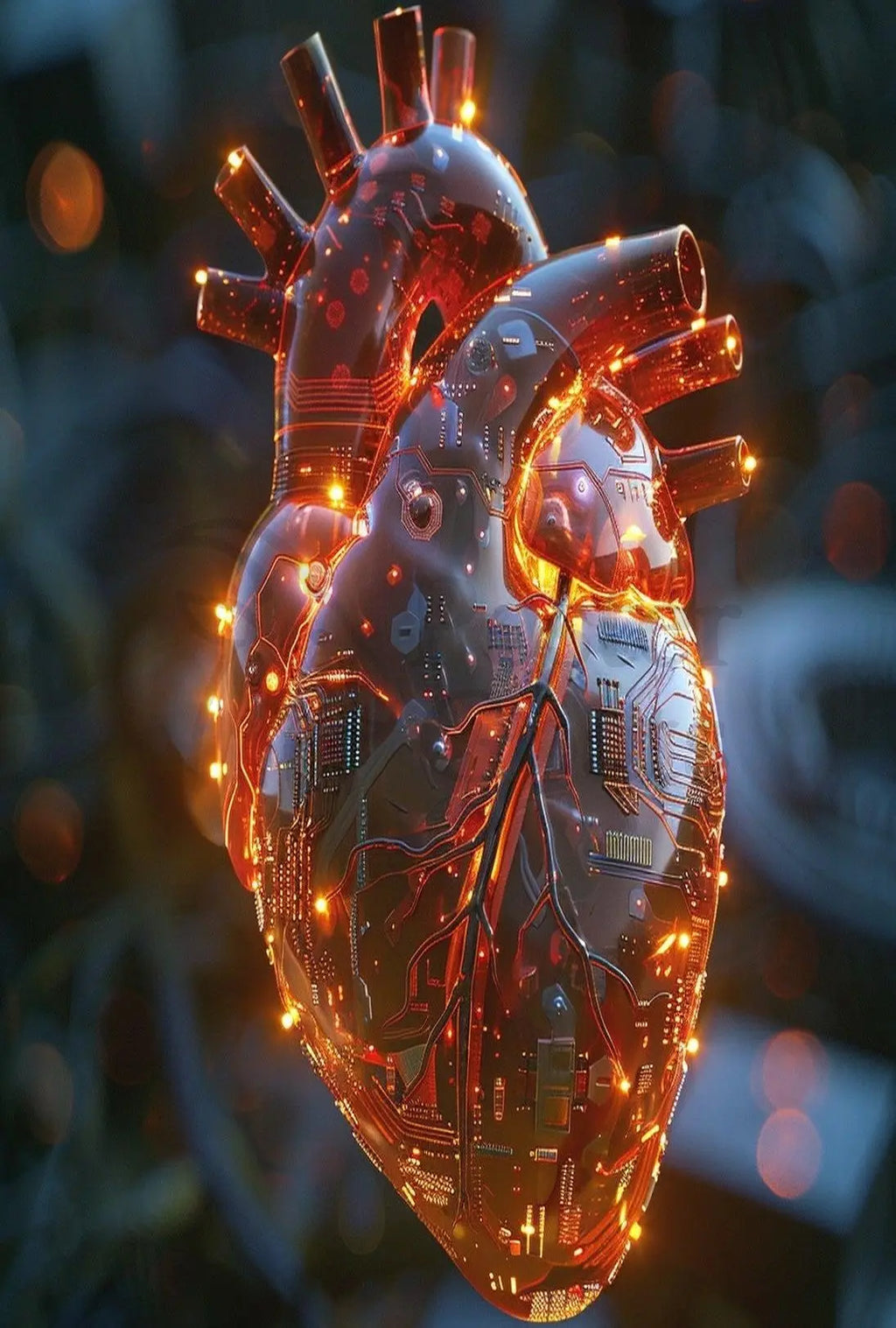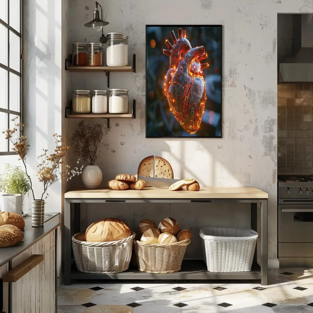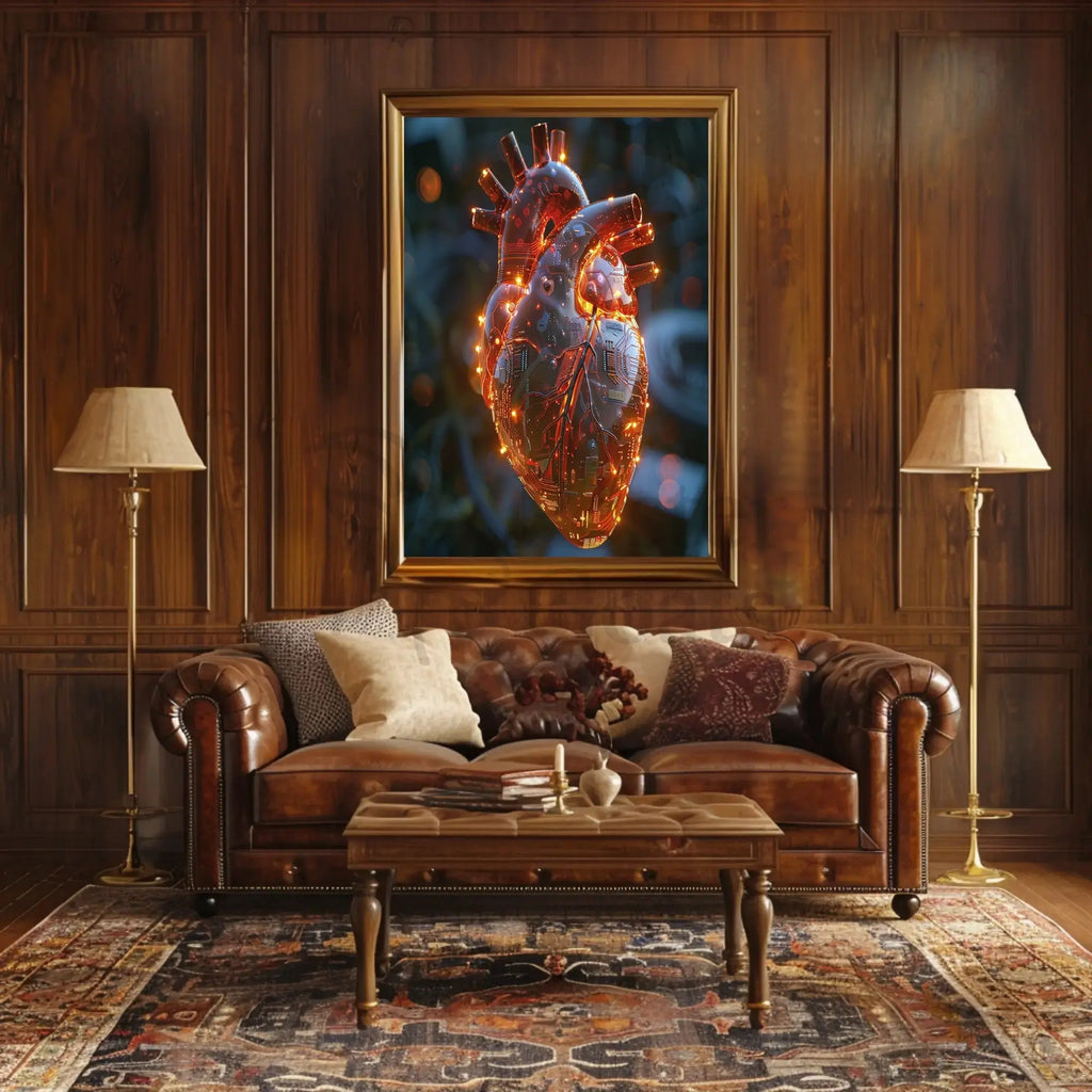 This poster showcases a photorealistic anatomical heart rendered as a glowing circuit board, with intricate traces, microchip textures and warm neon highlights that pulse against a moody, blurred background. The result is a bold cyberpunk aesthetic that reads equally well in contemporary living rooms, home offices, studios, or entertainment spaces.