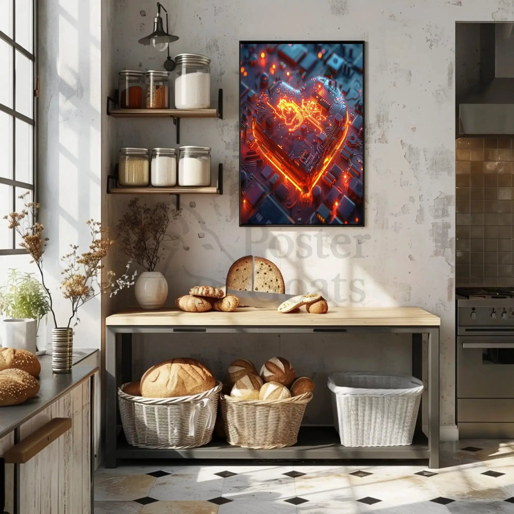 Futuristic Love Circuit Board Design brings together cutting-edge sci-fi aesthetics and intimate symbolism in a single, striking poster from PosterGoat. A glowing, neon-orange heart is sculpted from layered circuit board details—traces, chips, and micro-components—creating a vivid contrast against deep blue and graphite tones. The result is modern wall art that feels alive: circuitry becomes emotion, technology becomes expression.
