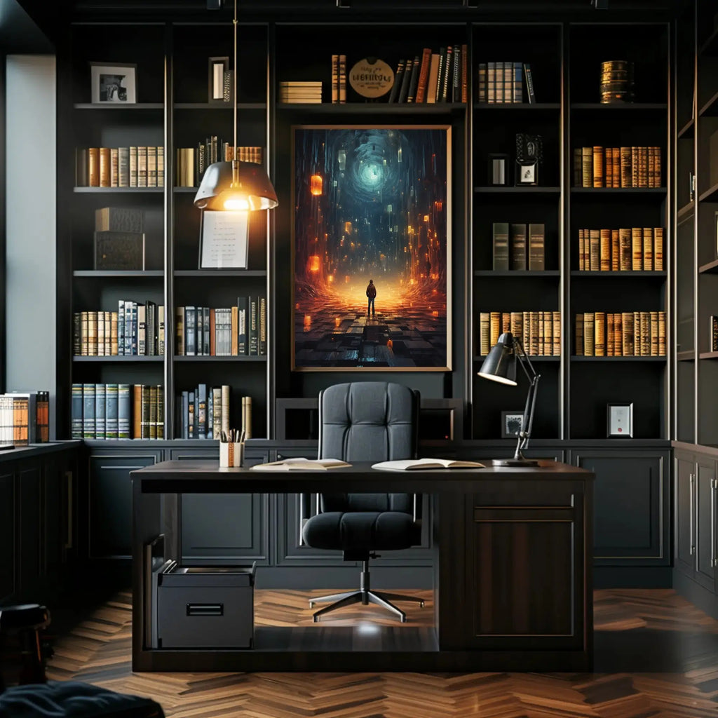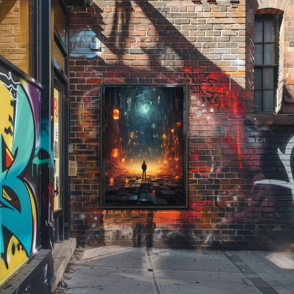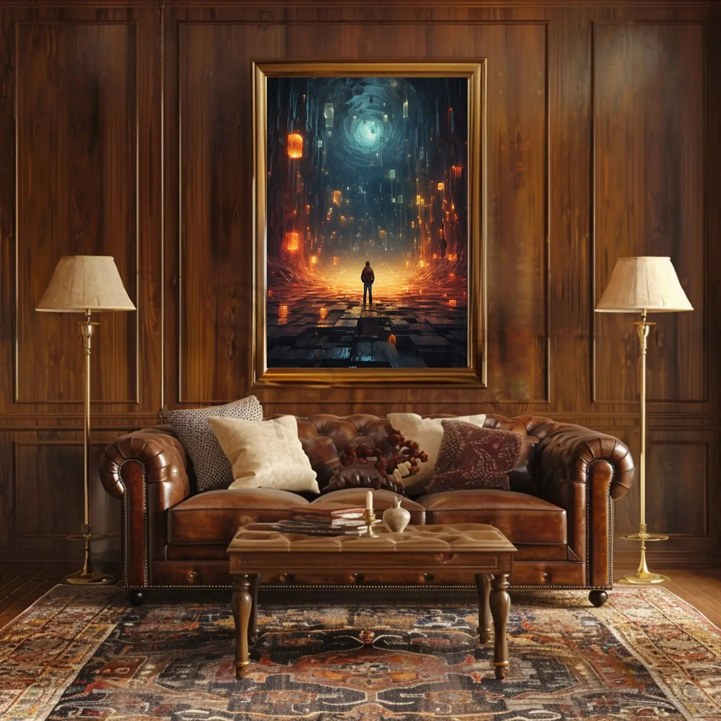 Step into a visionary world with the Futuristic Odyssey: Journey Beyond the Vortex Sci-Fi Poster from PosterGoat — an immersive digital painting that blends geometric design, glowing cubes, and a mesmerizing cosmic vortex to create a scene of exploration and transformation. A lone figure stands on a textured, grid-like floor as warm amber lights rise around them toward a cool, spiraling light above — a perfect balance of mystery, introspection, and futuristic energy.