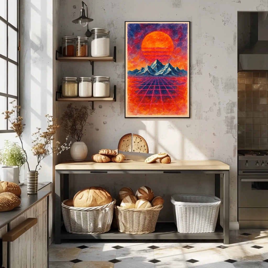 Step into a surreal retro-futuristic world with this stunning poster. The artwork showcases a series of jagged mountains framed against a massive sun, bursting with bold orange and red hues. A magenta and purple grid pattern stretches across the lower portion, echoing the 1980s synthwave style. The sky is a mesmerizing blend of reds, purples, and blues, setting a backdrop for an awe-inspiring sunrise or sunset. Drawing from both retro-futurism and surrealism, this piece evokes nostalgia while offering a glimpse into a futuristic vision, making it a must-have for art enthusiasts.