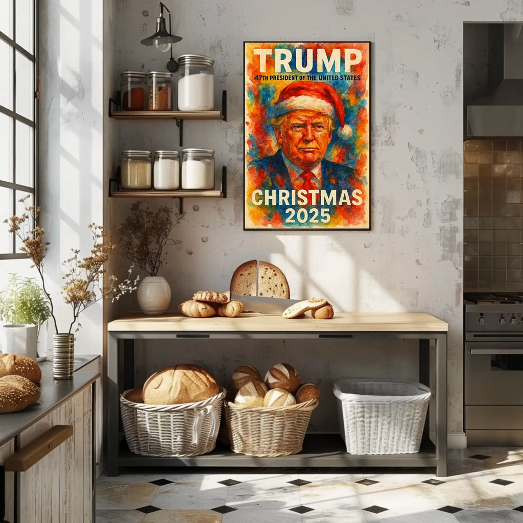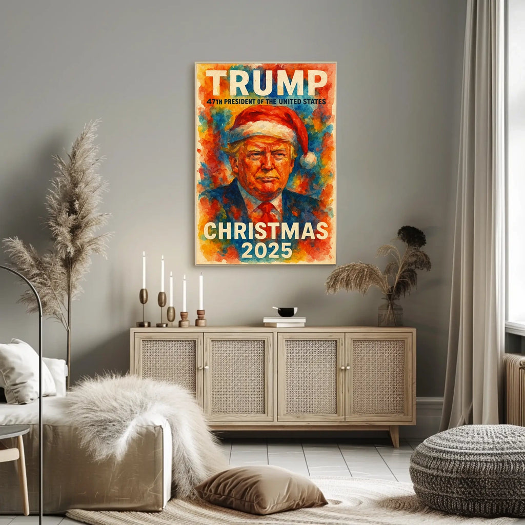 Celebrate the holiday season with Futuristic Santa with Political Edge - Christmas Poster, a thought-provoking twist through this stylized watercolor portrait. The subject's Santa hat playfully juxtaposes with the bold text claiming "47th President of the United States," embossed beside the year "Christmas 2025." This visually engaging poster embodies a futuristic political fantasy, melding cheer with curiosity concerning speculated leadership. Its daring artistic style presents a blend of whimsy and intellect, making it a conversation starter during festive times. Perfectly suited for those who relish unique holiday decorations mixed with imaginative presidential foresight.