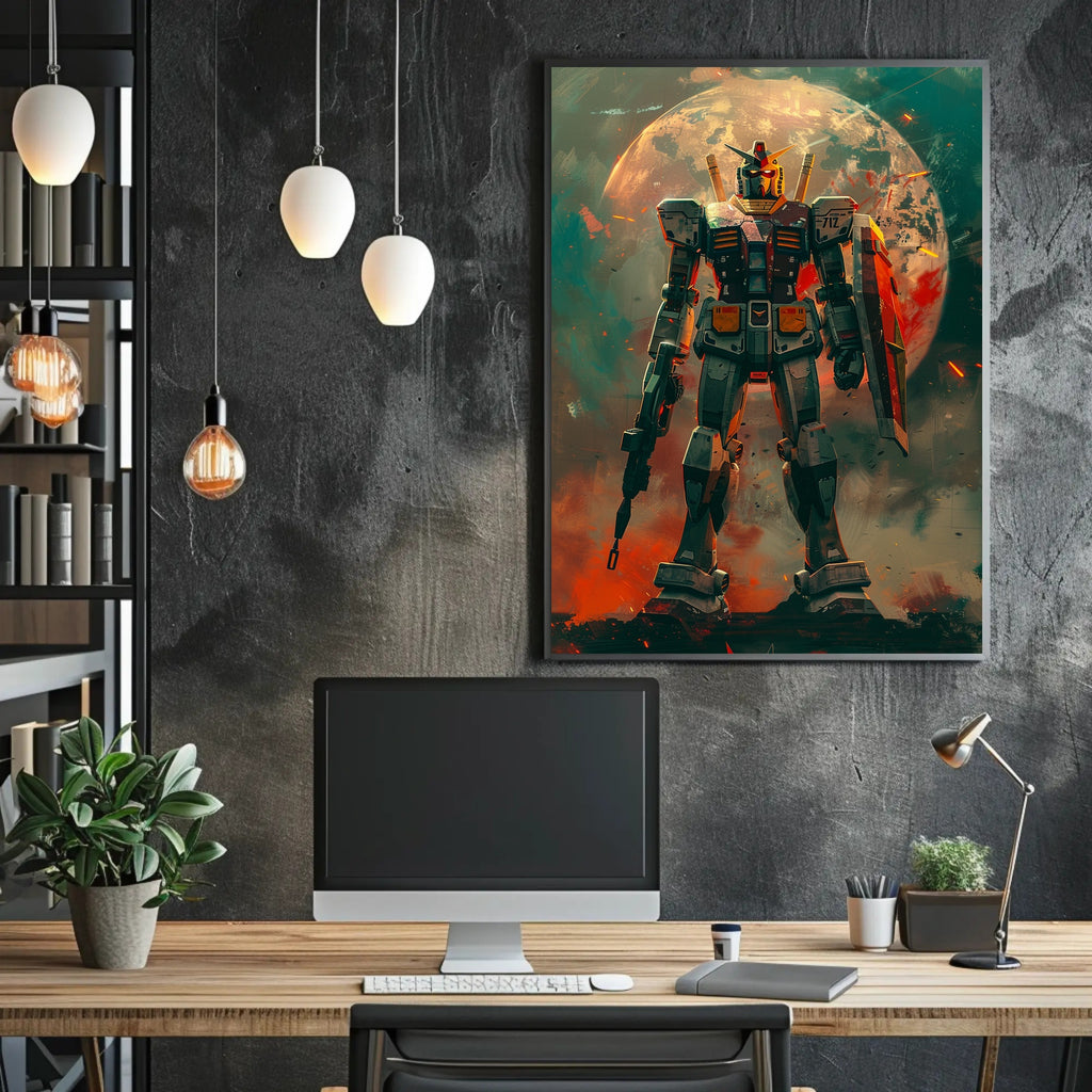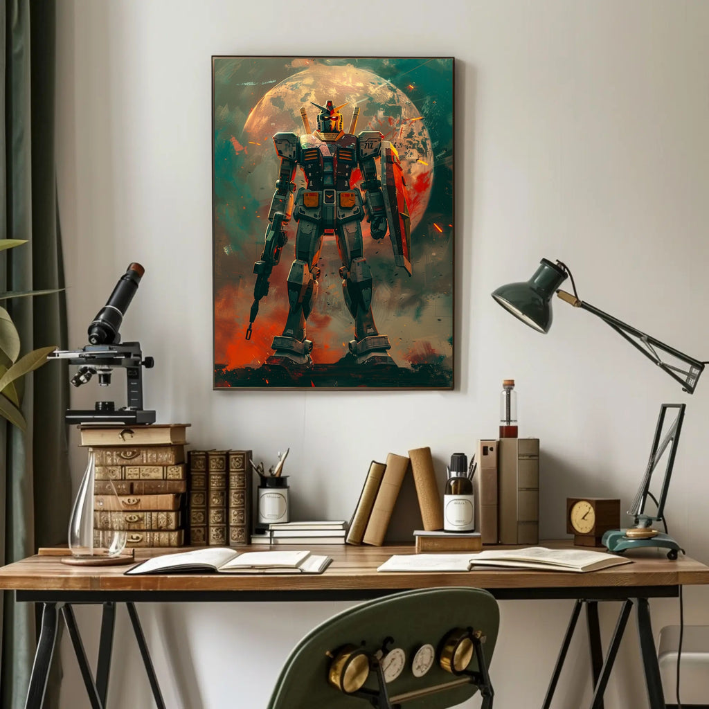 Bring home an iconic fusion of sci‑fi drama and pop art swagger with the Galactic Mech Warrior Art Print Poster Decor by PosterGoat. This striking poster captures a towering mech warrior framed against a glowing, cratered planet — vivid teal and ember tones, precise mechanical detail, and cinematic lighting combine to create a dynamic centerpiece for any room.