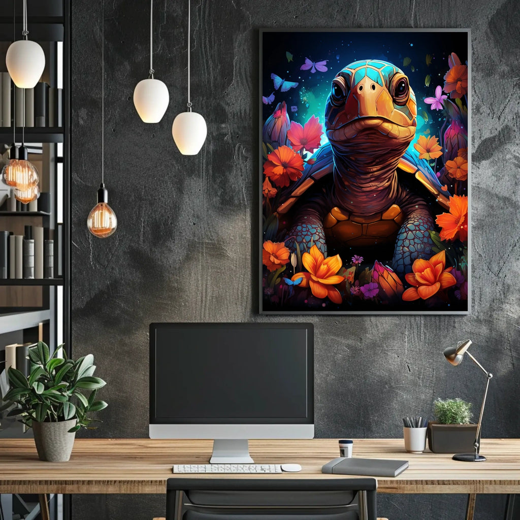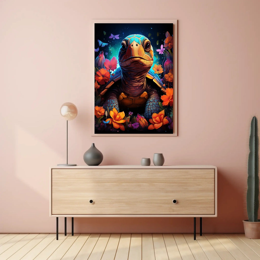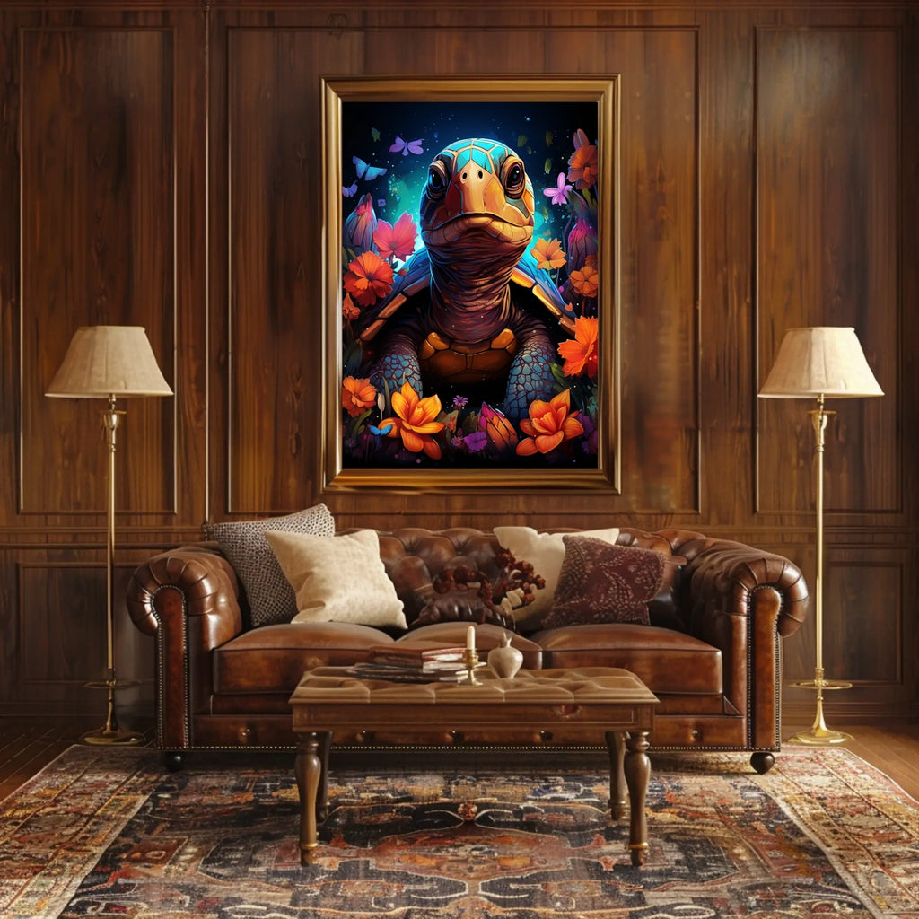Immerse yourself in nature with Garden Guardian, a vibrant illustration that centers a majestic turtle among a kaleidoscope of flowers and fluttering butterflies. This garden scene celebrates life and tranquility, delivering natural beauty and a soothing focal point for any room.