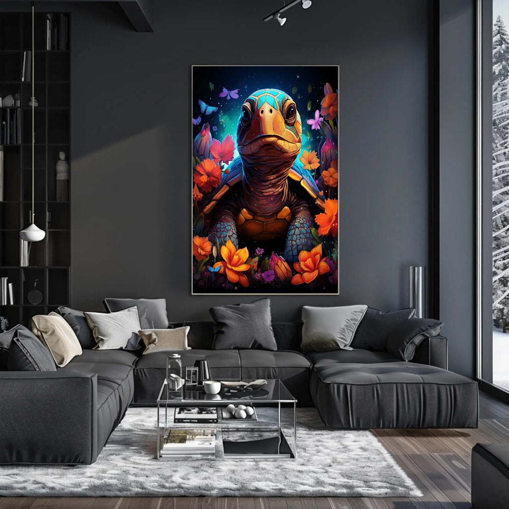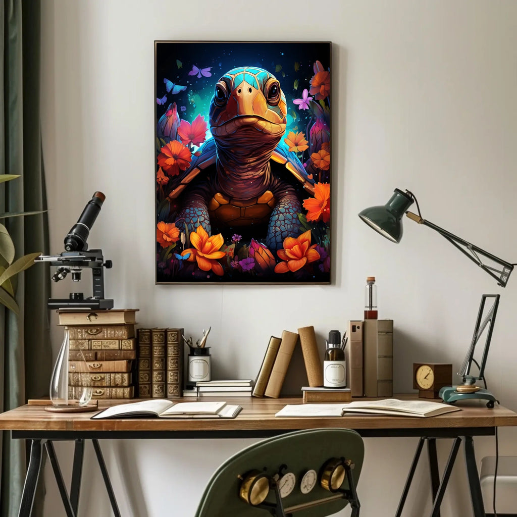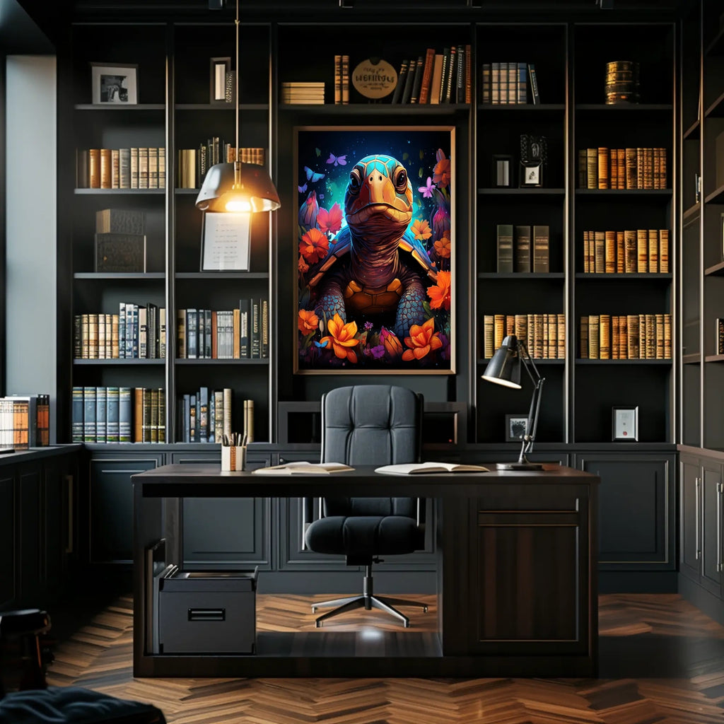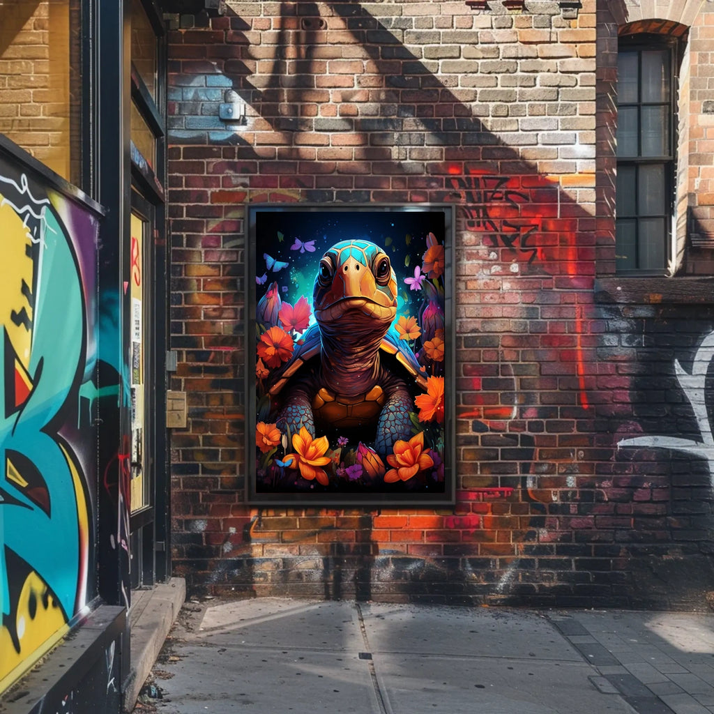 Immerse yourself in nature with Garden Guardian, a vibrant illustration that centers a majestic turtle among a kaleidoscope of flowers and fluttering butterflies. This garden scene celebrates life and tranquility, delivering natural beauty and a soothing focal point for any room.