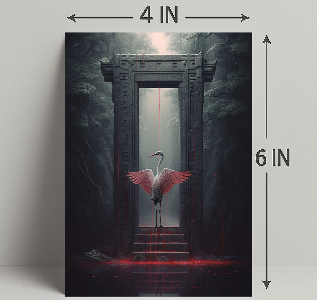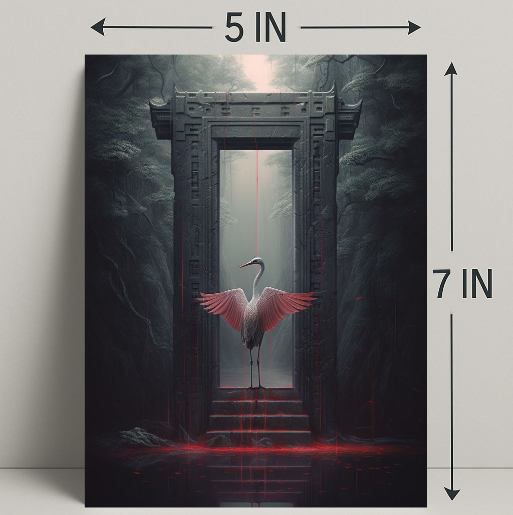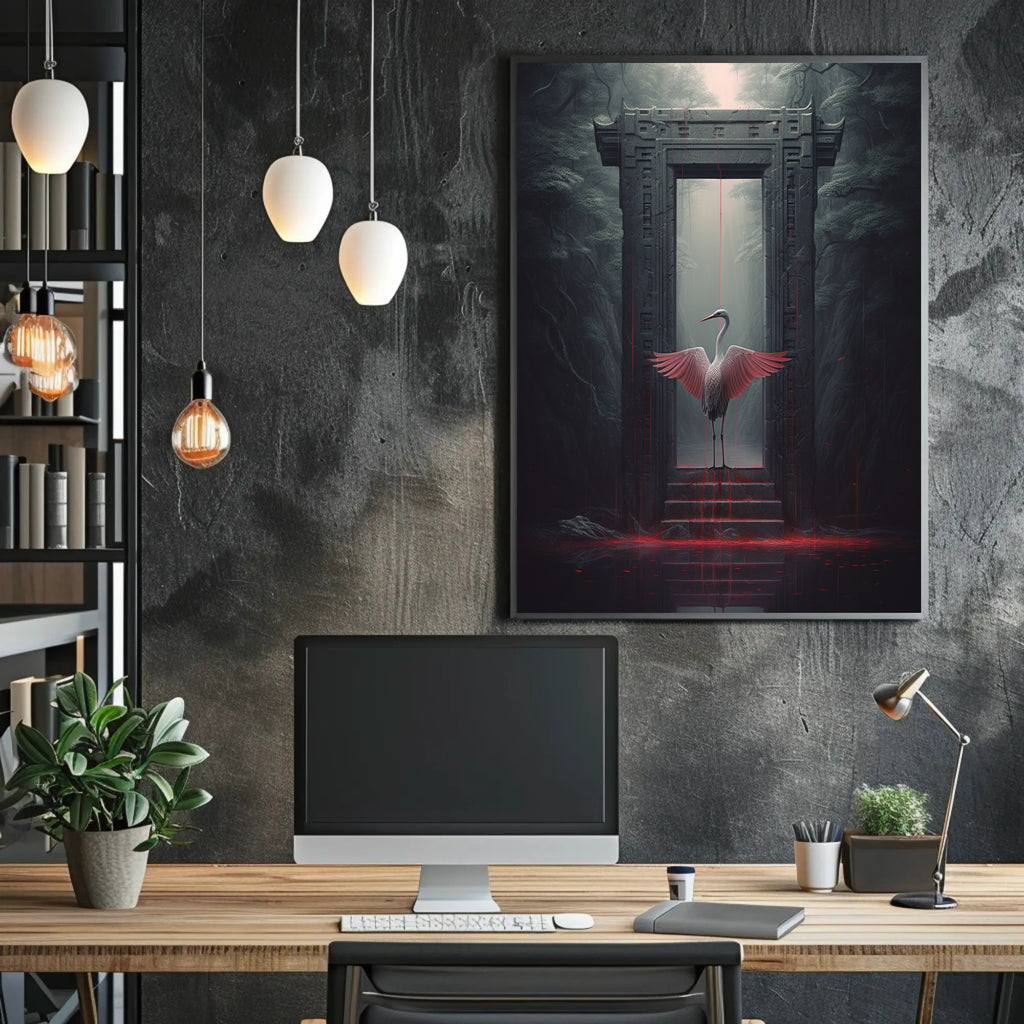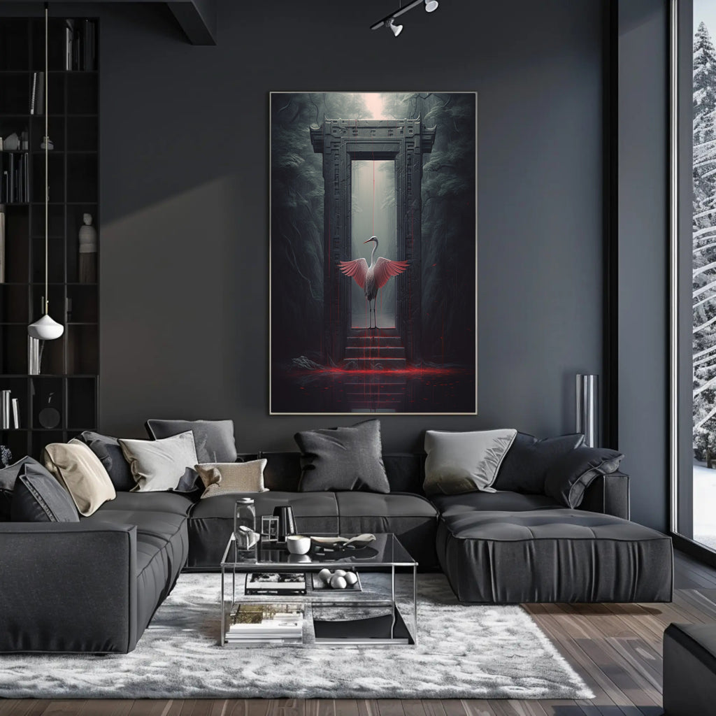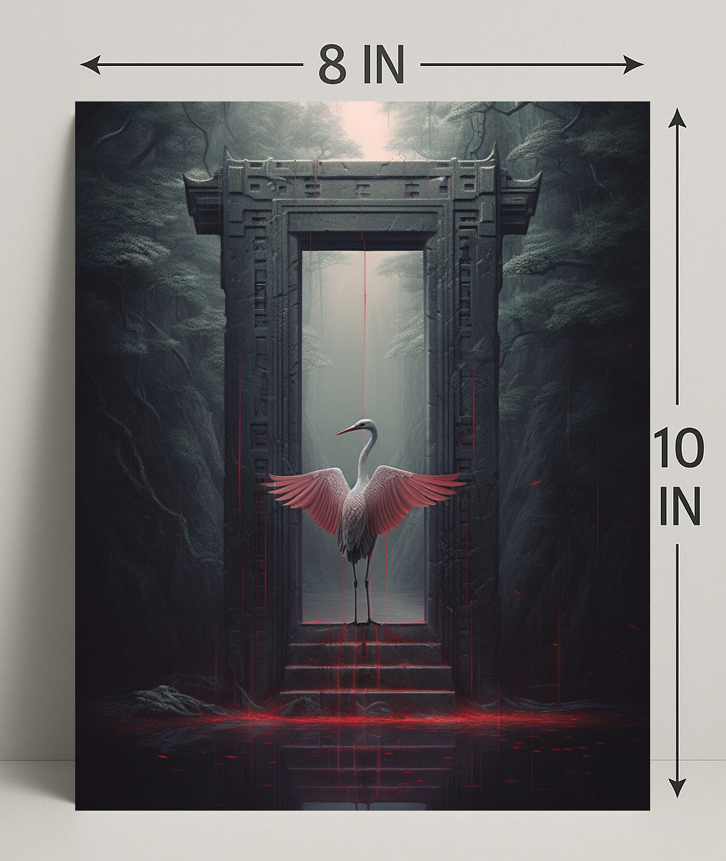 Mesmerizing focal art: A solitary crane framed by a monumental stone portal creates instant visual impact — perfect for living rooms, bedrooms, offices, or creative spaces.