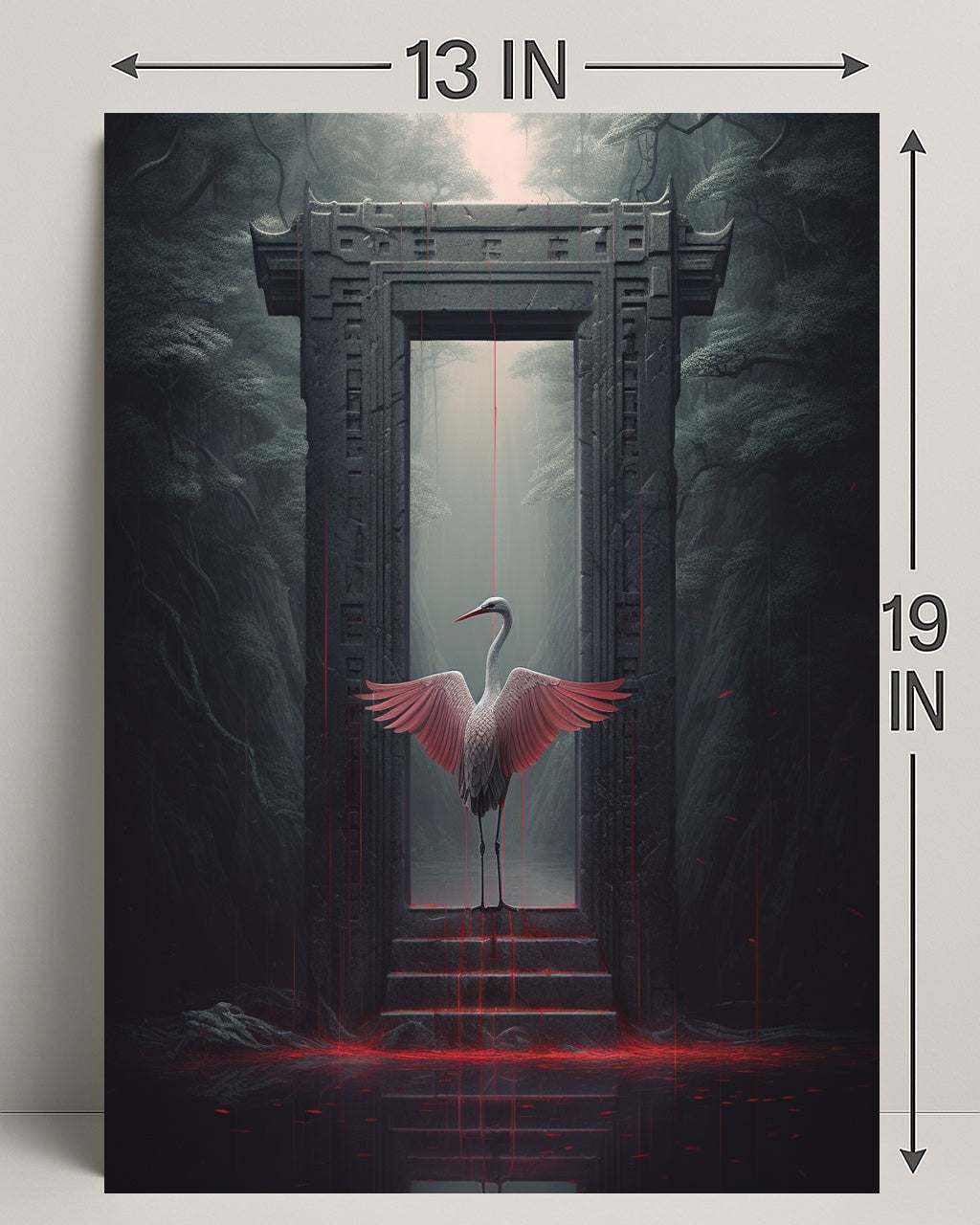 Invoke calm and curiosity with the Gateway Of Serenity Poster from PosterGoat — a striking art print that blends minimalist composition with cinematic, scenic storytelling. Centered on an ancient stone gateway framed by misty forest cliffs, a graceful crane with soft pink-red wings stands poised on weathered steps above a mirror-like pool, while subtle glowing red accents trace through the scene for an otherworldly focal point.