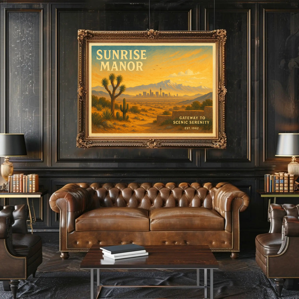 Capture a moment of wanderlust with the Gateway to Scenic Serenity Travel Poster from PosterGoat — a vintage-inspired artwork that blends minimalist design with warm, cinematic landscape tones. This travel poster features a sun-drenched desert foreground, iconic cacti and a Joshua-tree silhouette, layered valleys leading to distant mountains, and a subtle city skyline on the horizon — all rendered in a timeless, painterly style that invites calm and exploration.