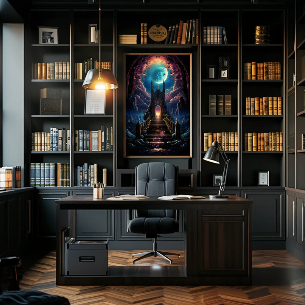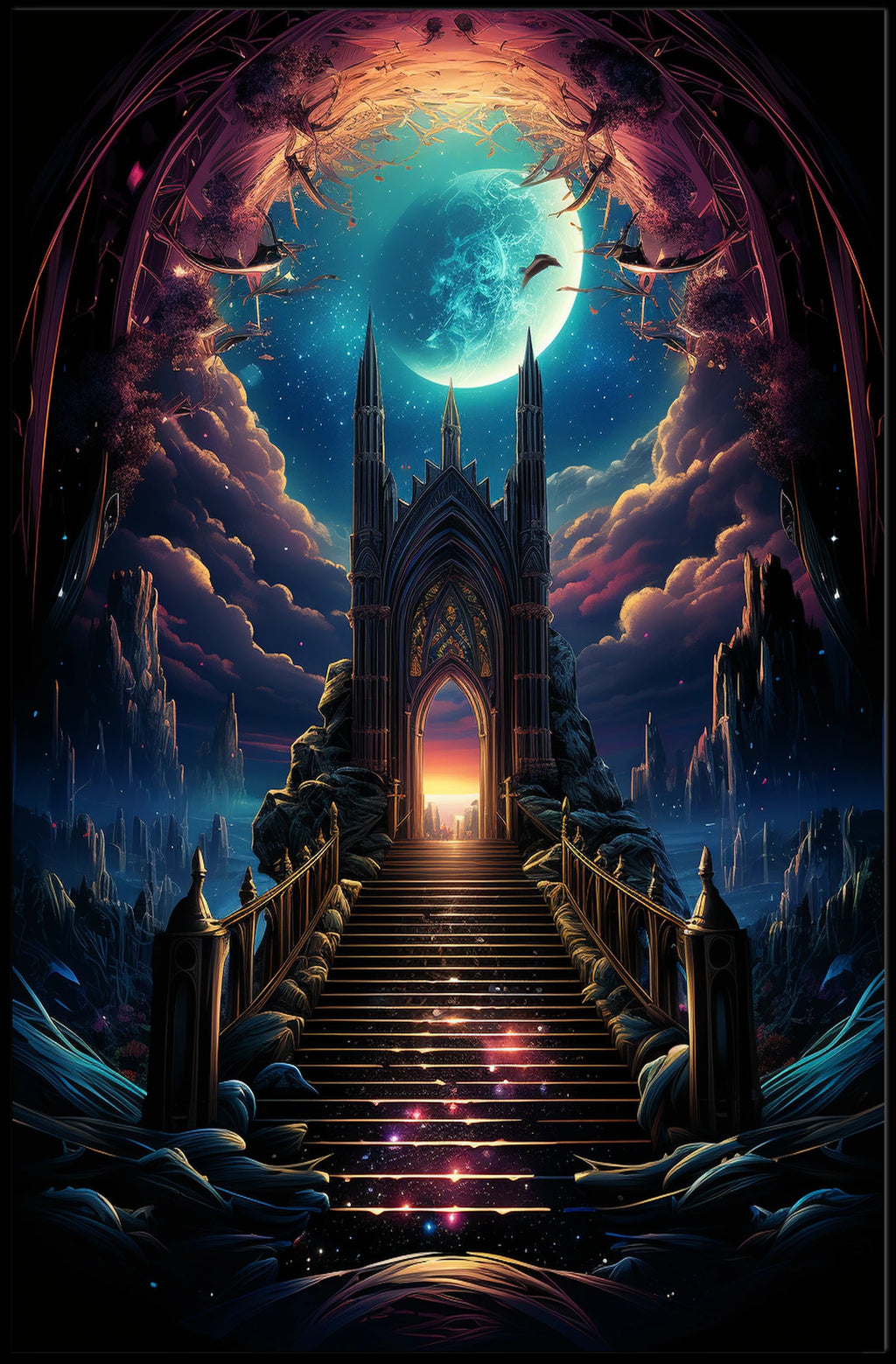 Gateway to the Celestial Realm invites you to step into a luminous dream where magic and imagination converge. This enchanting poster showcases a majestic staircase ascending to an ethereal portal beneath a radiant moonlit sky. Surrounded by otherworldly landscapes and vibrant cosmic hues, it sparks curiosity and invites a moment of quiet awe in any space.