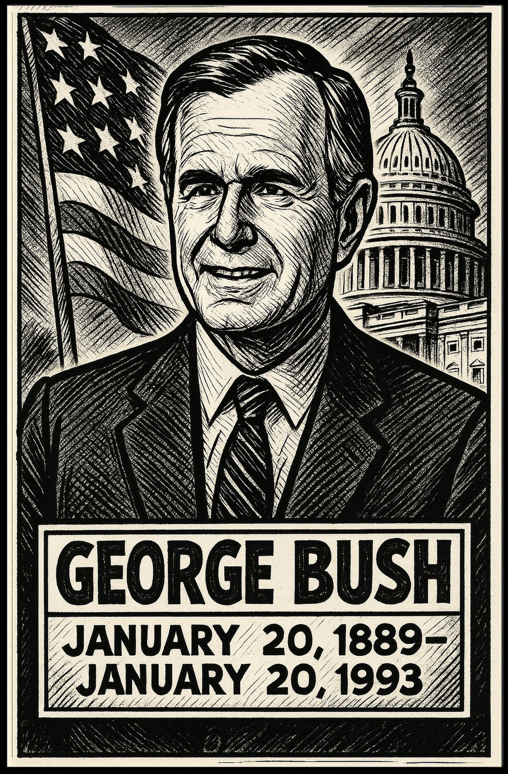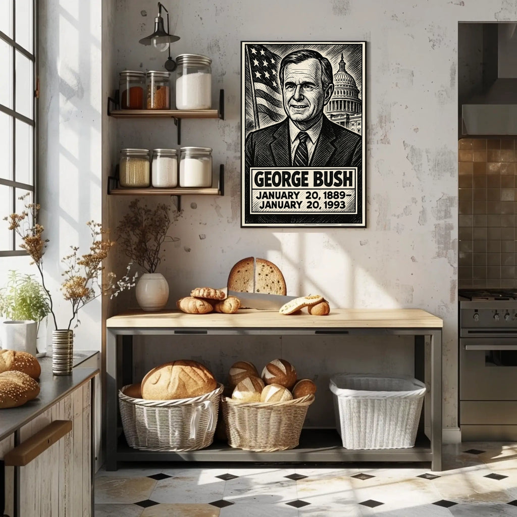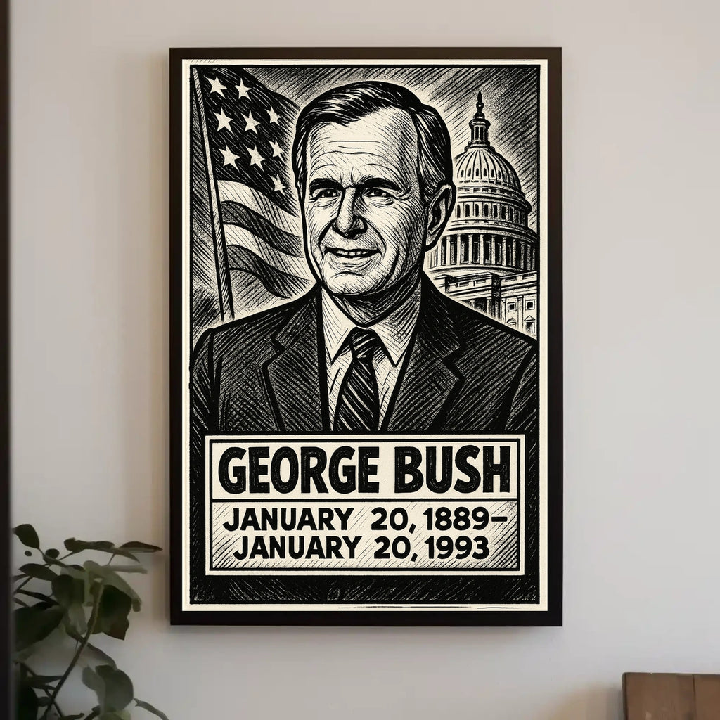 Elevate your walls with a bold, black-and-white tribute to George H. W. Bush, the 41st President of the United States. This poster blends history, politics, and pop-art energy into a striking line-art piece that sparks conversations in any room.