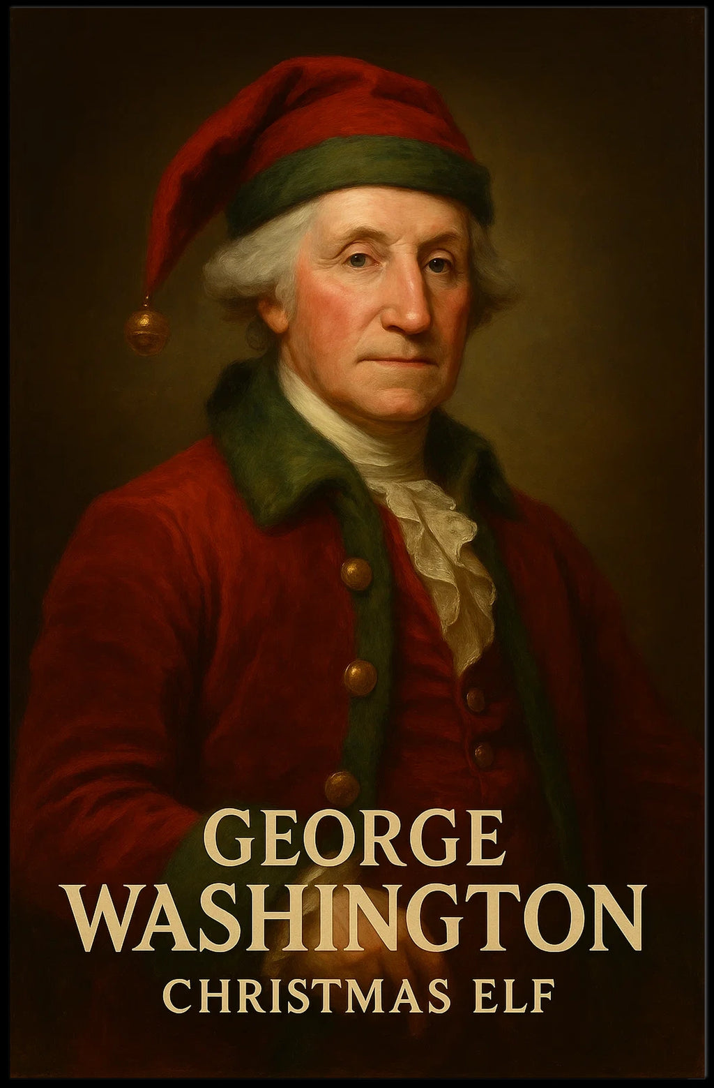 Featuring the text "GEORGE WASHINGTON CHRISTMAS ELF," this unique poster injects merriment into holiday decor, making it perfect for collectors, history enthusiasts, or anyone seeking a standout gift this season.