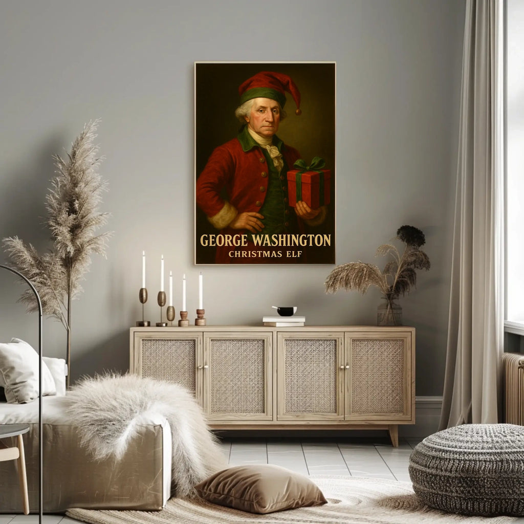 Ideal for fans of art prints, christmas decor, christmas humor, and nostalgic poster art, this piece blends classic Christmas imagery with the historical figure of George Washington for a witty, conversation-starting decoration.