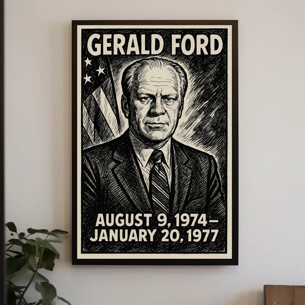 Celebrate American history with a bold, black-and-white comic sketch poster centered on the 38th President. This Gerald Ford piece blends political iconography with a playful comic style, creating a striking focal point for any room.