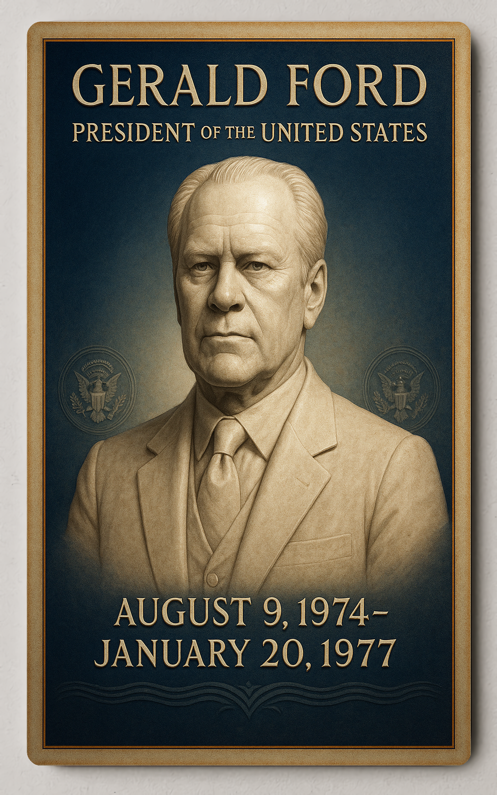 Celebrate a defining chapter in American history with the Gerald Ford President of the United States Trading Card from PosterGoats. This collectible trading card presents a finely detailed bust portrait of the 38th President, rendered with a vintage, sculpted look and framed by elegant, gold-embossed typography that names Gerald Ford and records his term dates: August 9, 1974 – January 20, 1977.