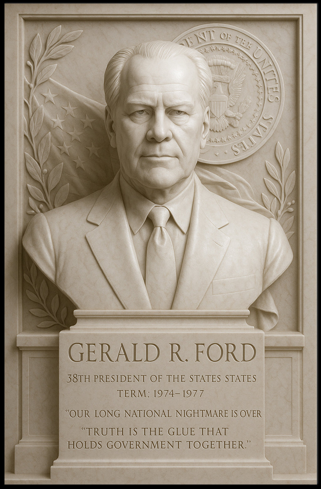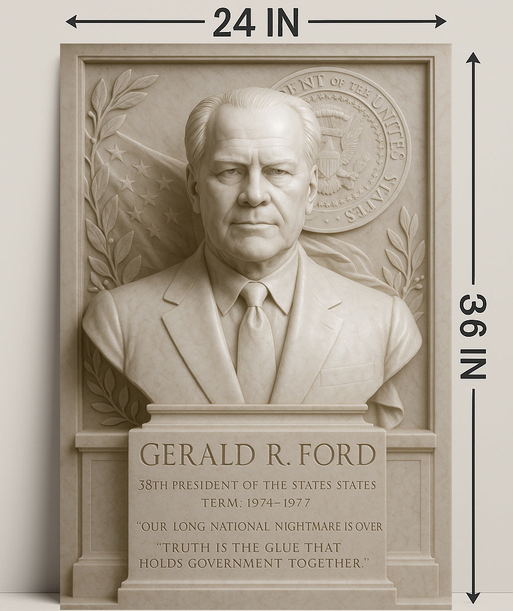 - Inspirational Quote: Displays Ford's famous quote, "Our long national nightmare is over," inspiring resilience and hope.