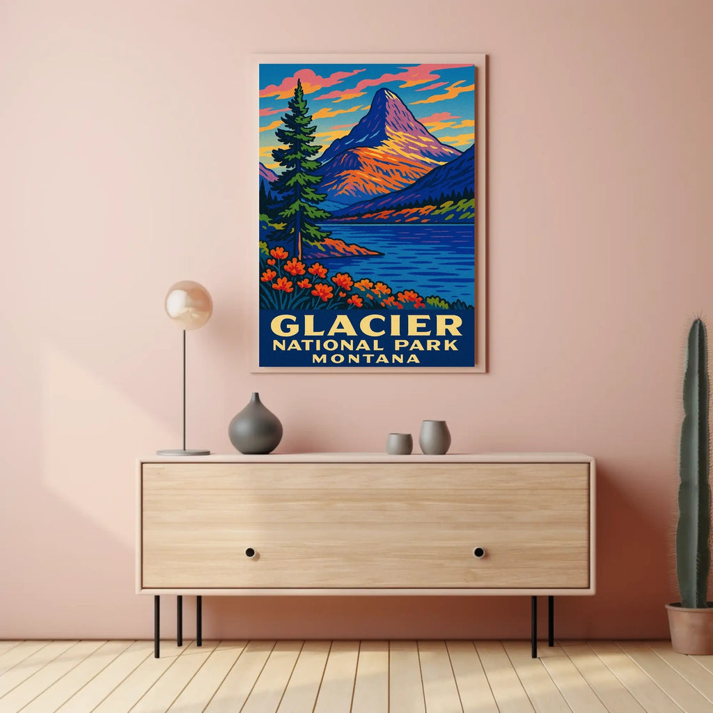 Whether displayed in a living room, bedroom, office, or classroom, this Glacier National Park poster brings the majesty of Montana into your space—combining artful composition with the atmosphere of iconic national park scenery. It’s an ideal addition to any wall art collection, serving as a memorable souvenir or gift that resonates with fans of art, travel, and the outdoors.